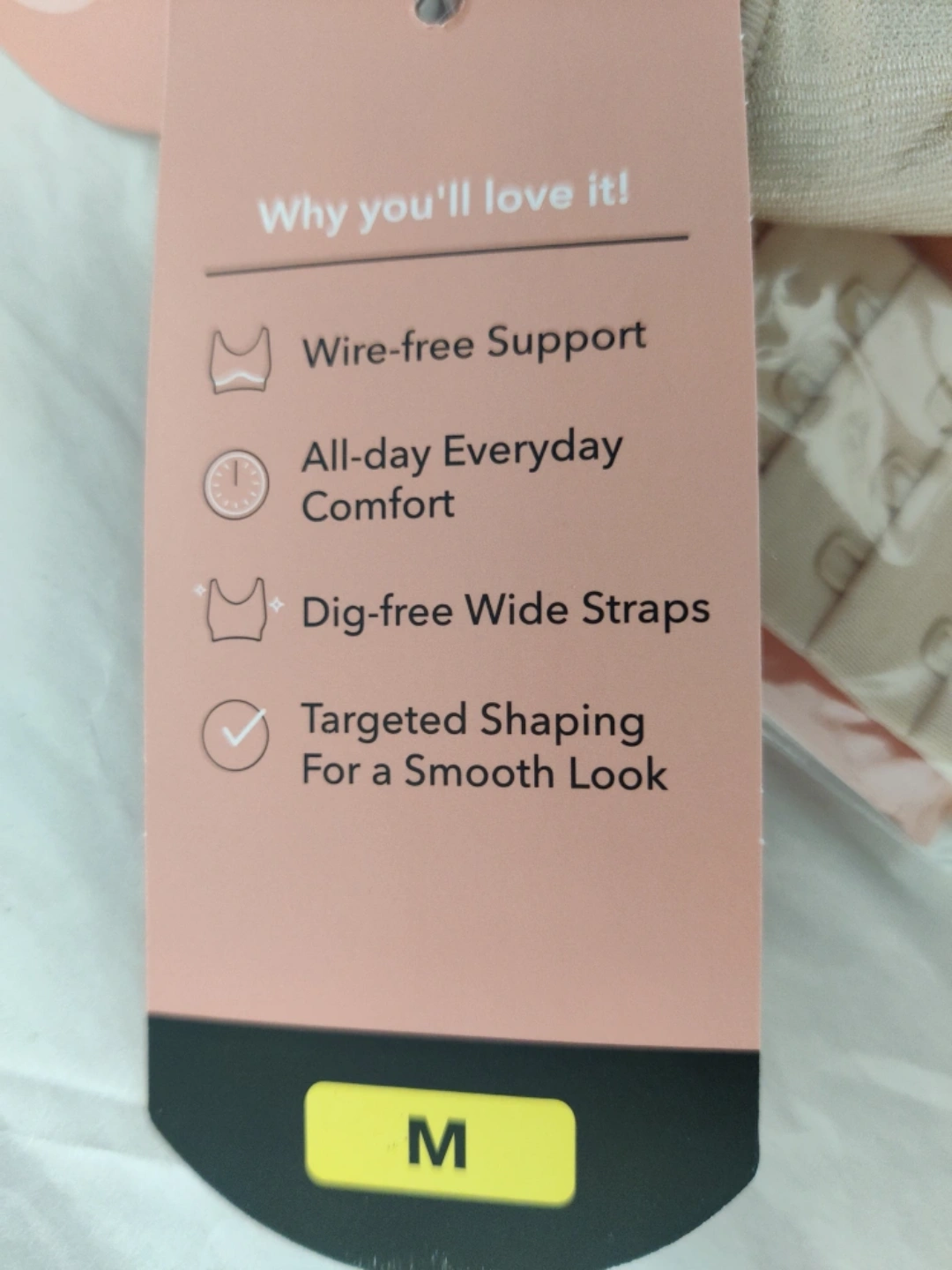 Wireless shaping bra. Beige colour. Medium size. Provides all-day support and comfort. Features targeted shaping and dig-free wide straps. Wire-free. Machine washable. Brand new with tag.