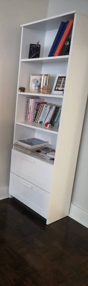 Tall white bookcase, four shelves, two drawers at the bottom. Great for organizing books, files, and decor. Some minor wear.