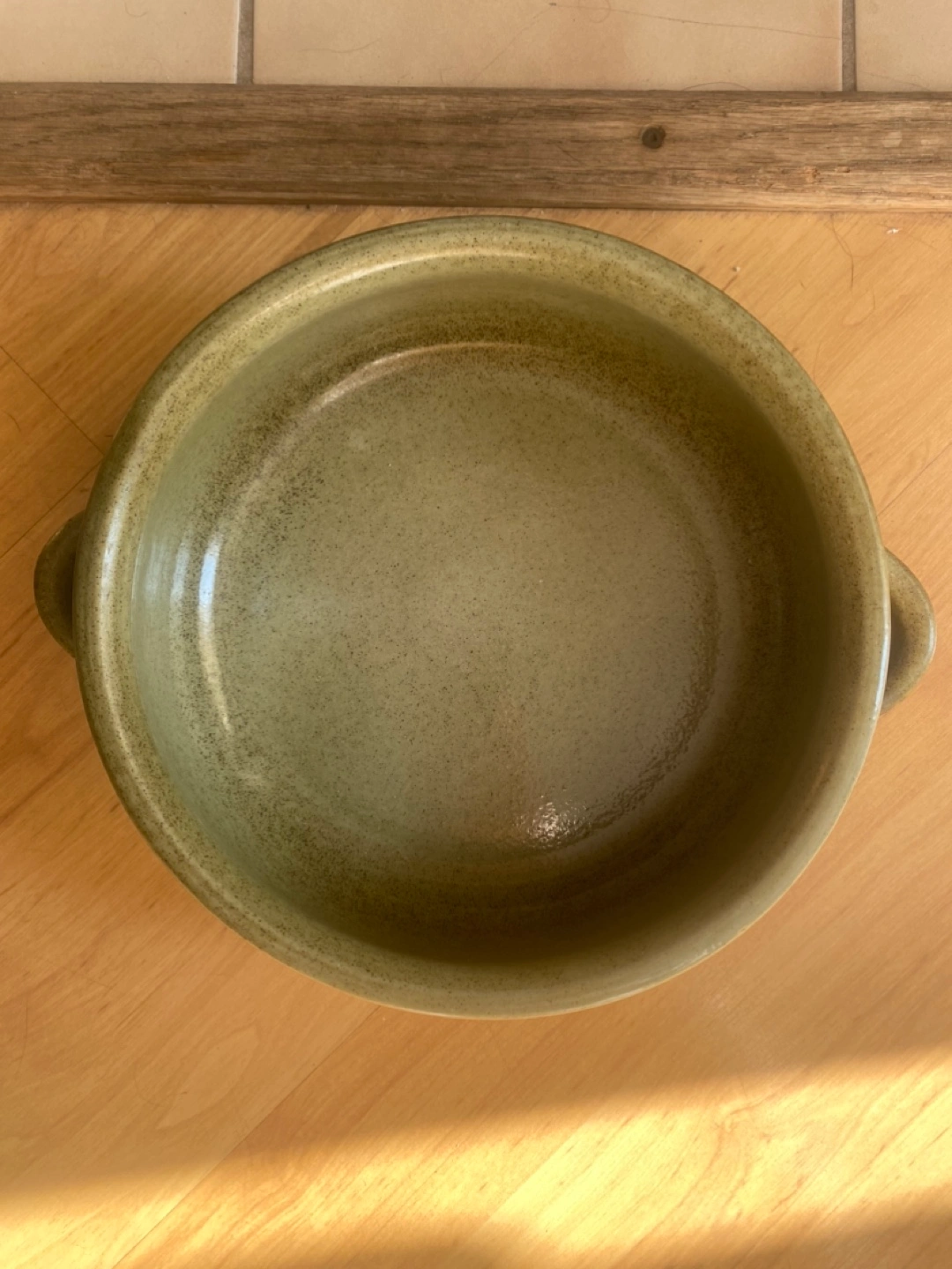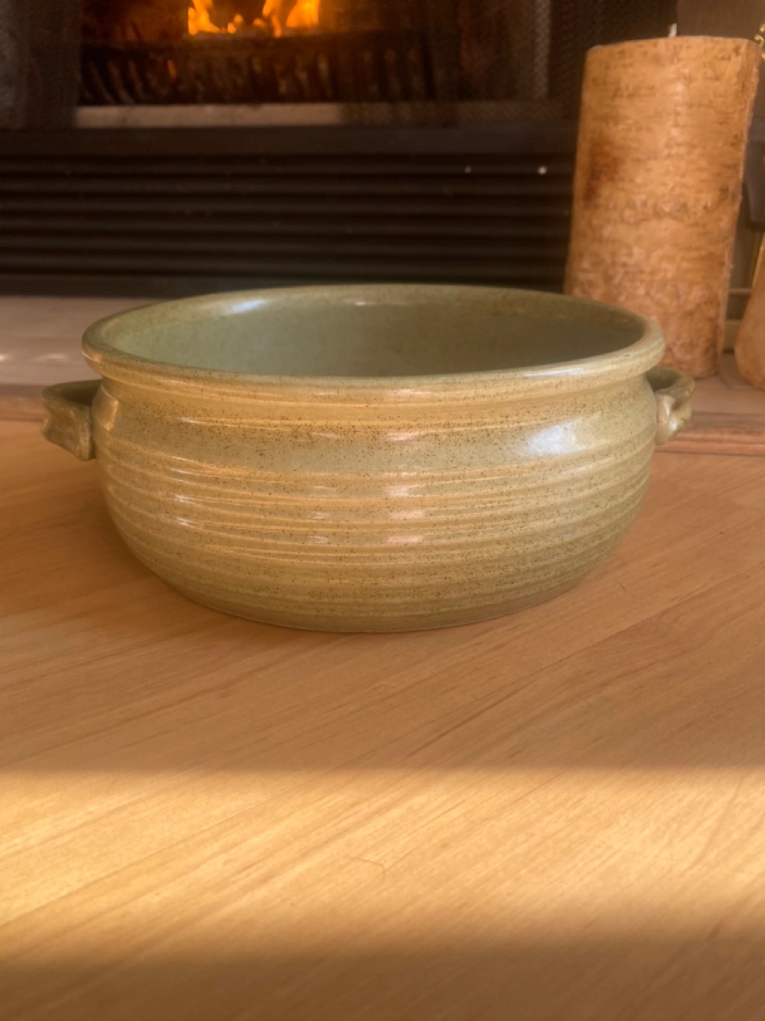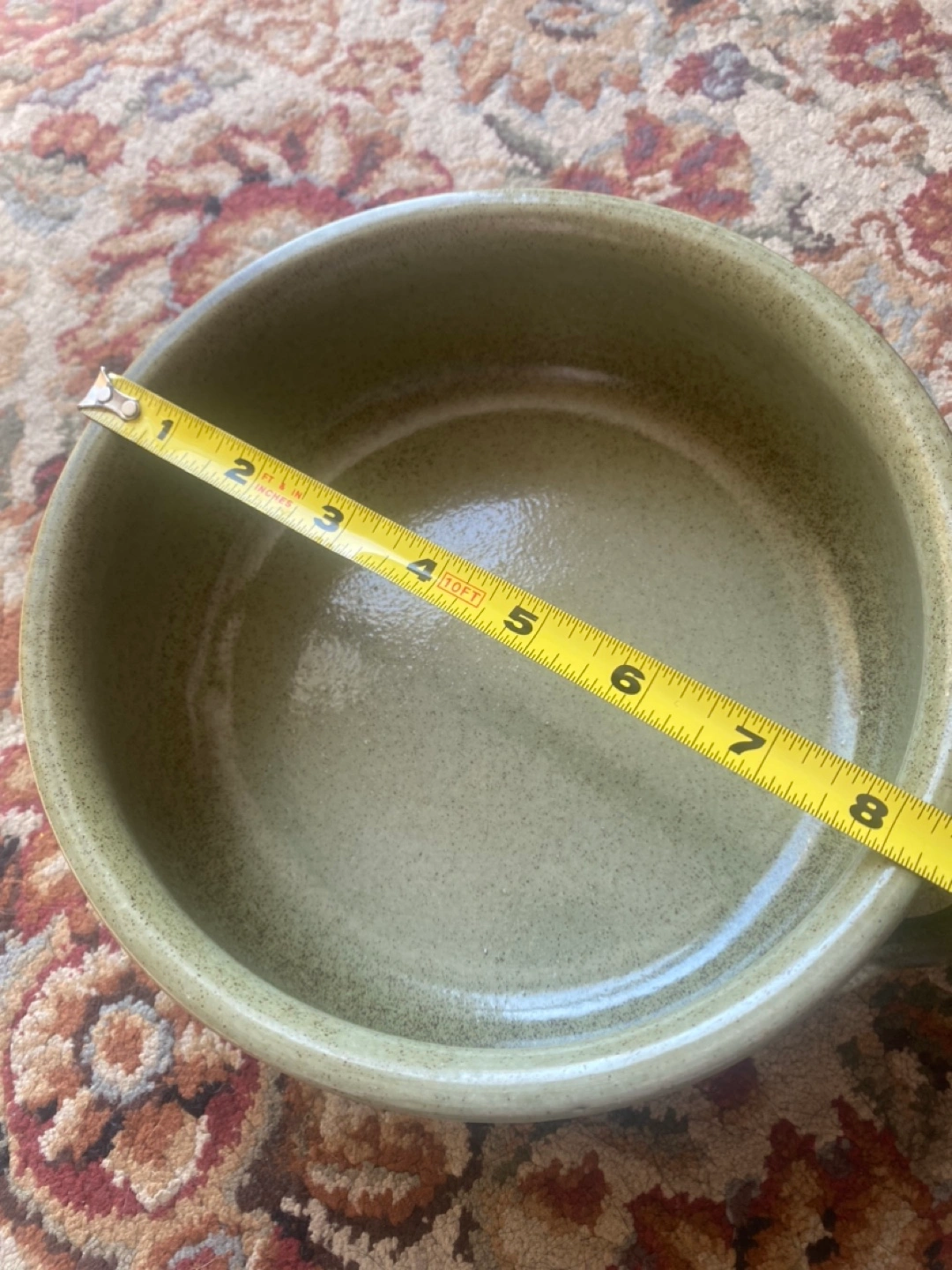 Large ceramic bowl. Olive green glaze. Two handles. Measures approximately 8 inches in diameter. I use it as a fruit bowl.