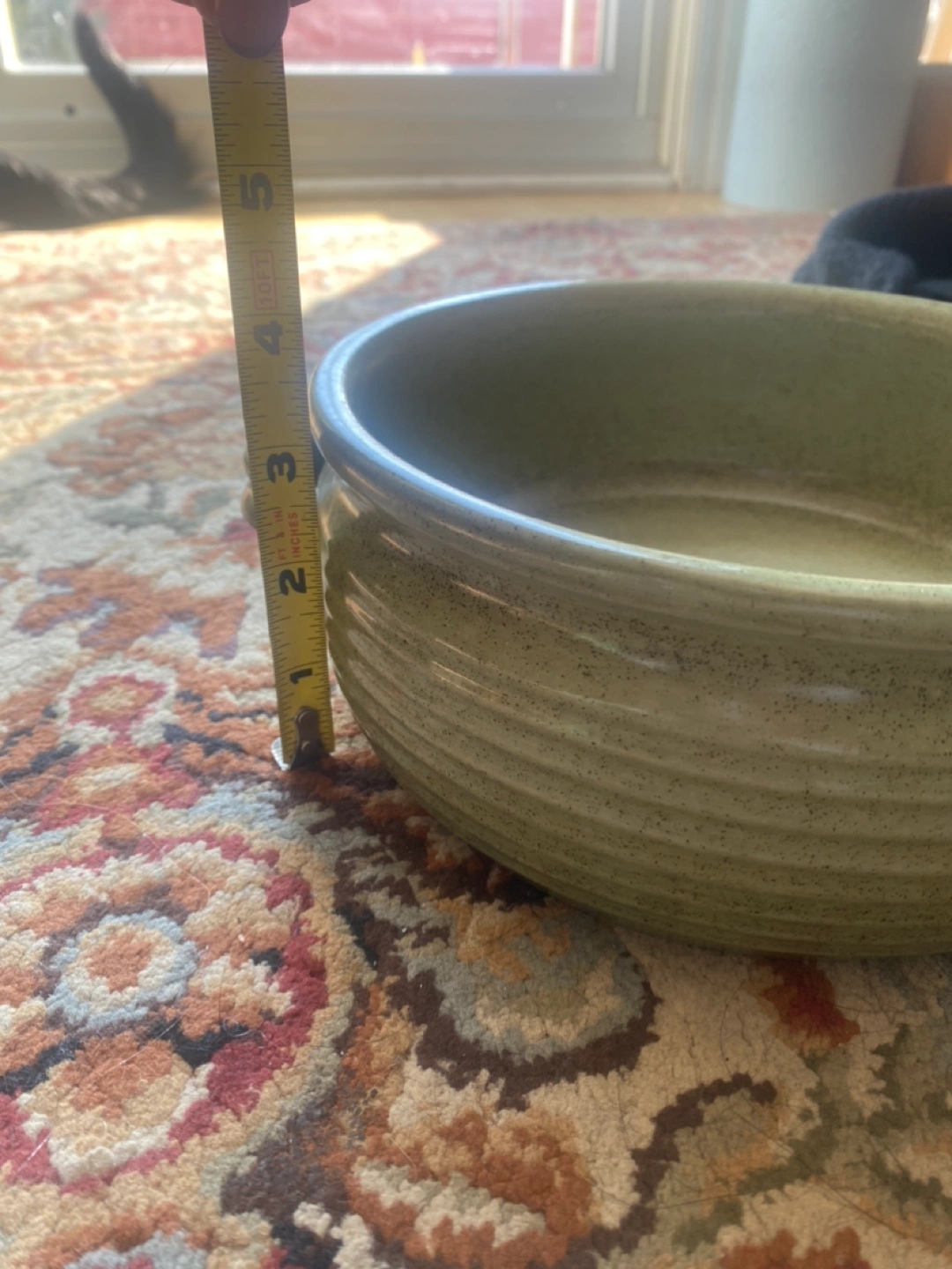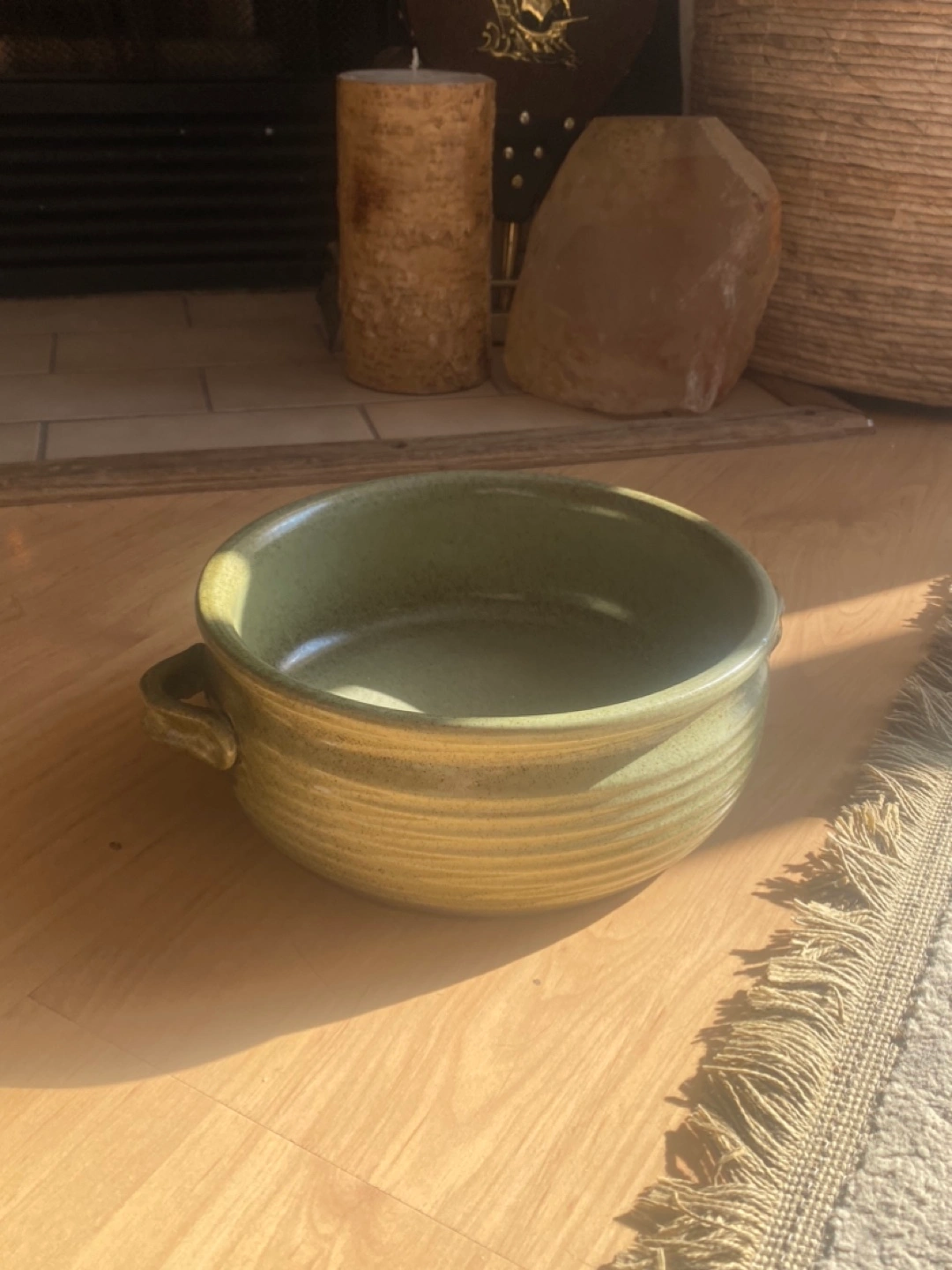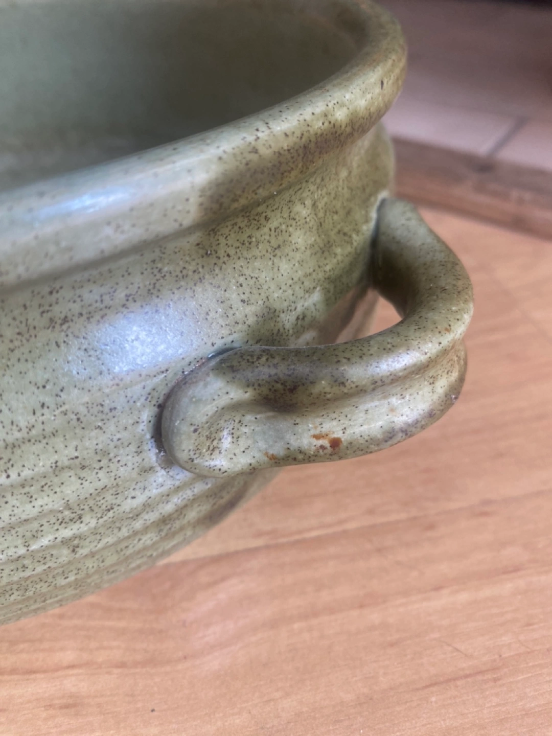 Large ceramic bowl. Olive green glaze. Two handles. Measures approximately 8 inches in diameter. I use it as a fruit bowl.