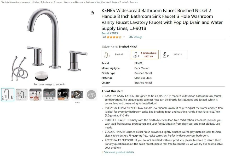 KENES Brushed Nickel 3-Hole Bathroom Faucet