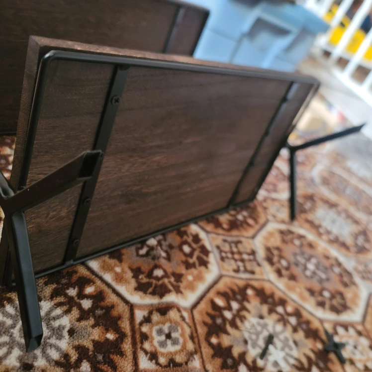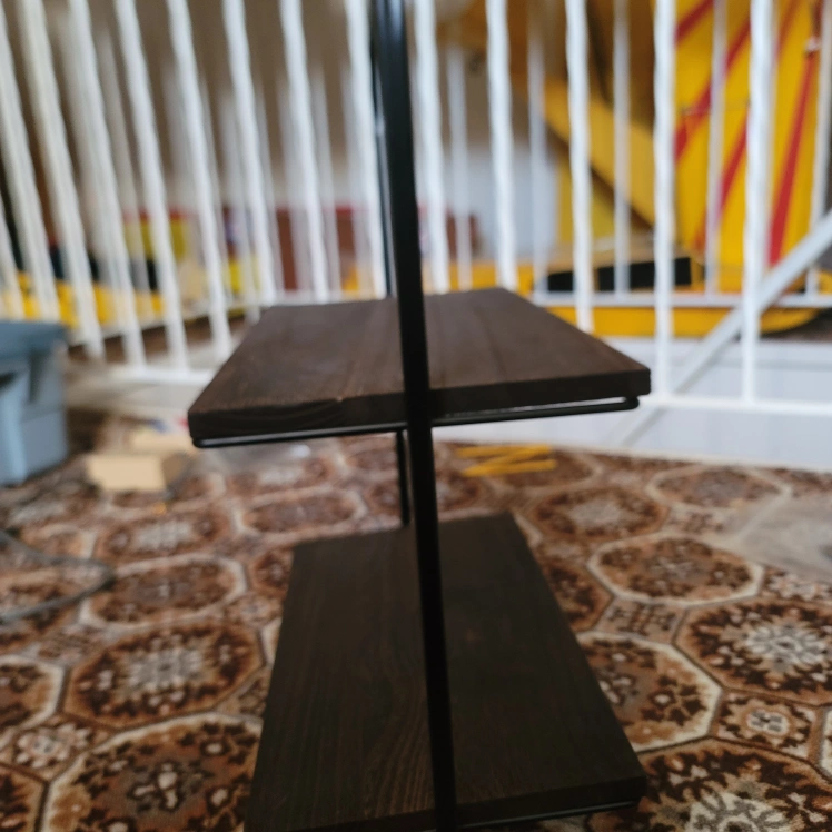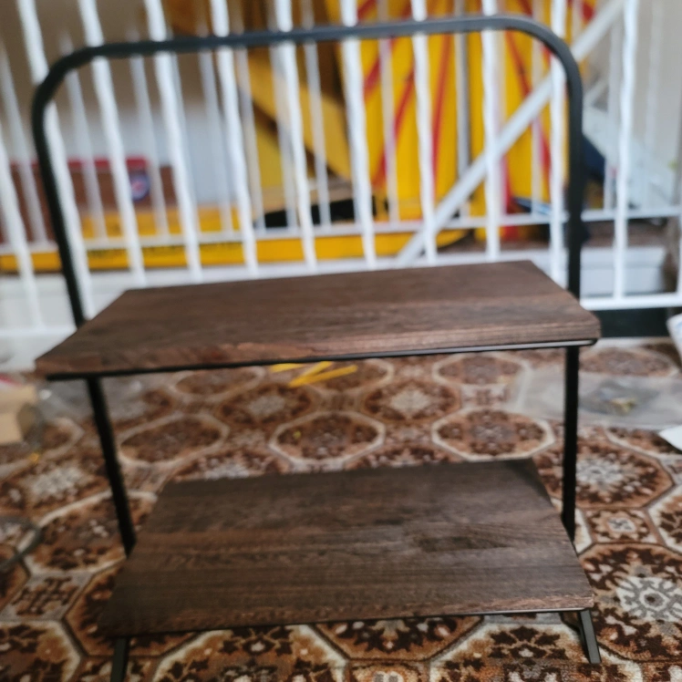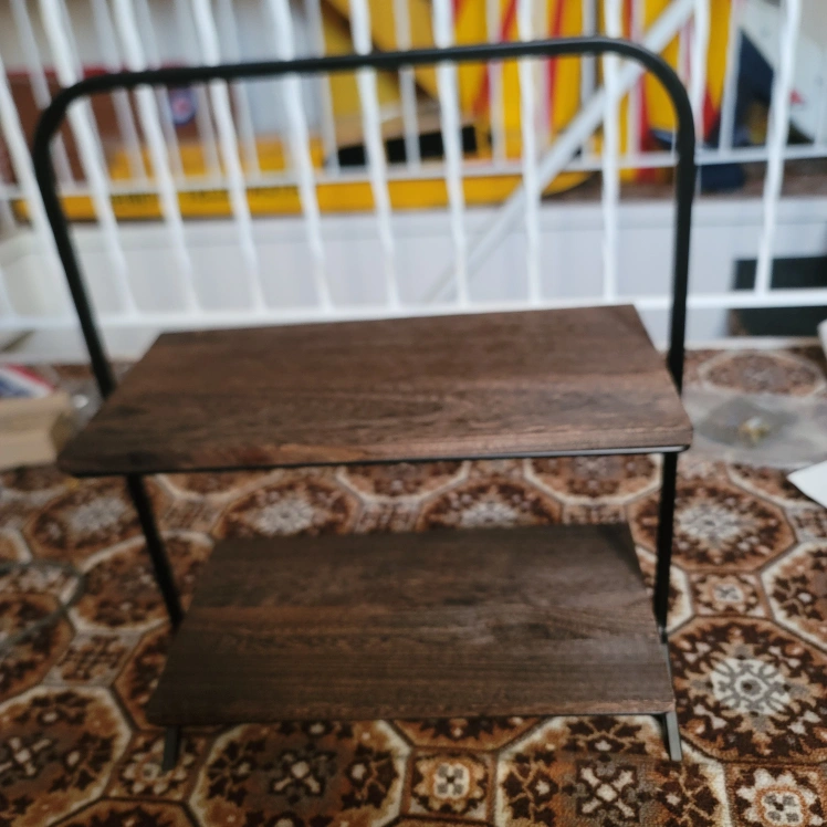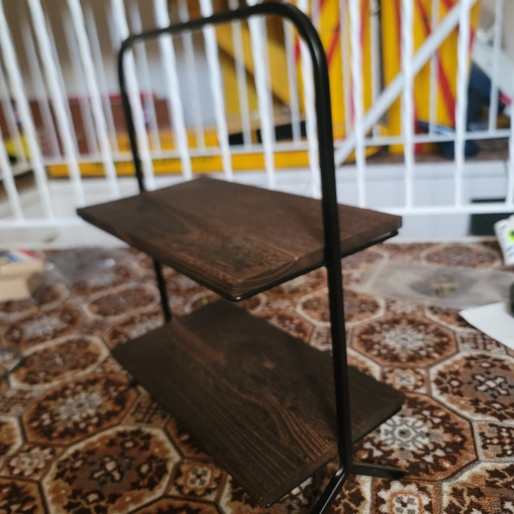 Small two-tiered shelf. Dark brown wood shelves and black metal frame. Ideal for small spaces. Minimalist design. brand new never been used.