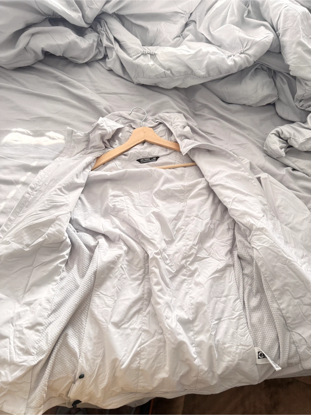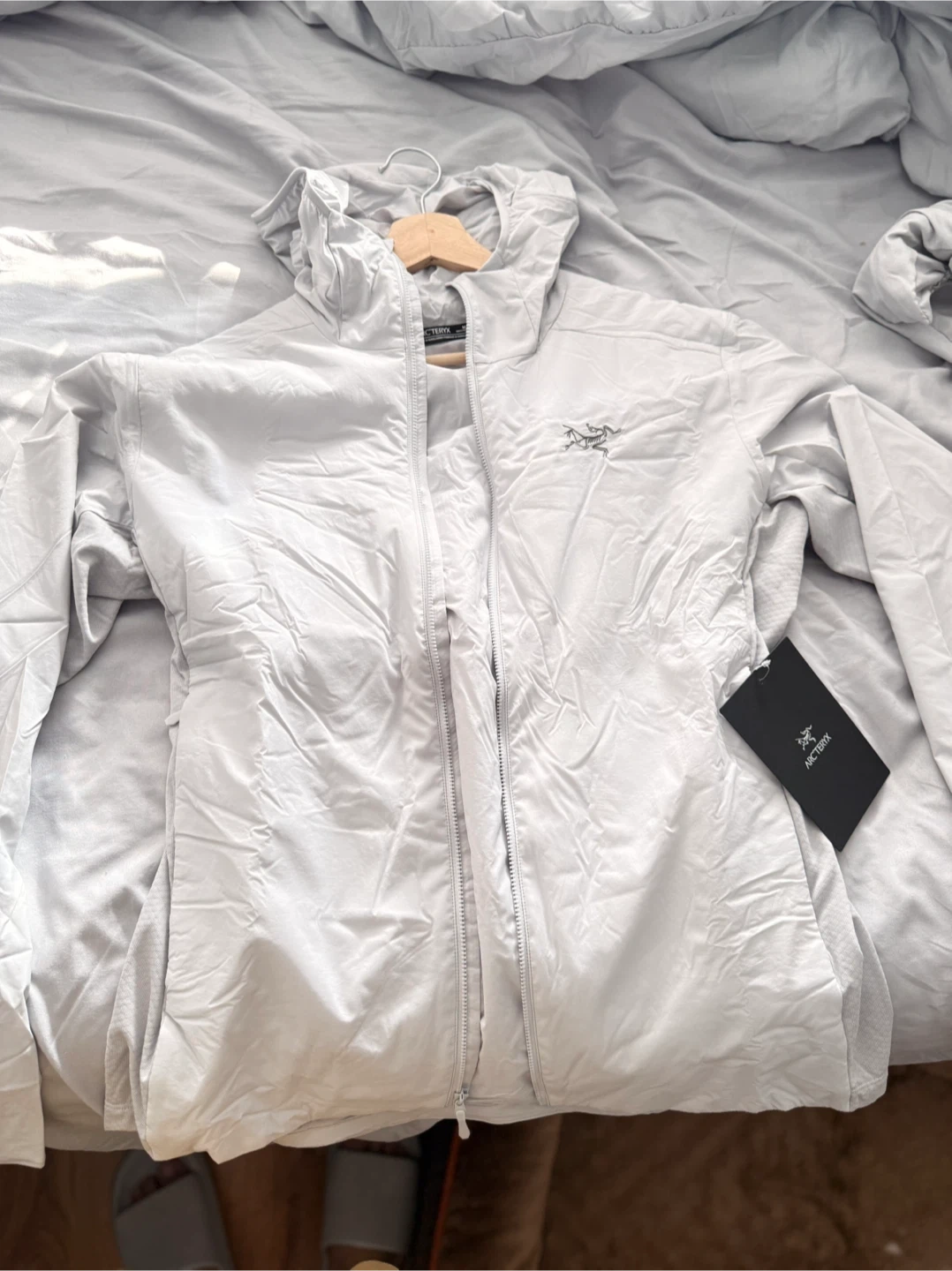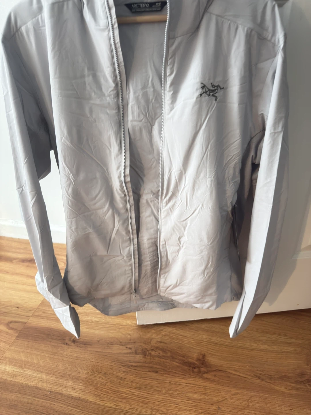 Selling an Arc'teryx Atom SL Hoody in men's size M. The original price was $280. It's a lightweight hoody perfect for layering or wearing on its own. The color is a versatile light gray.