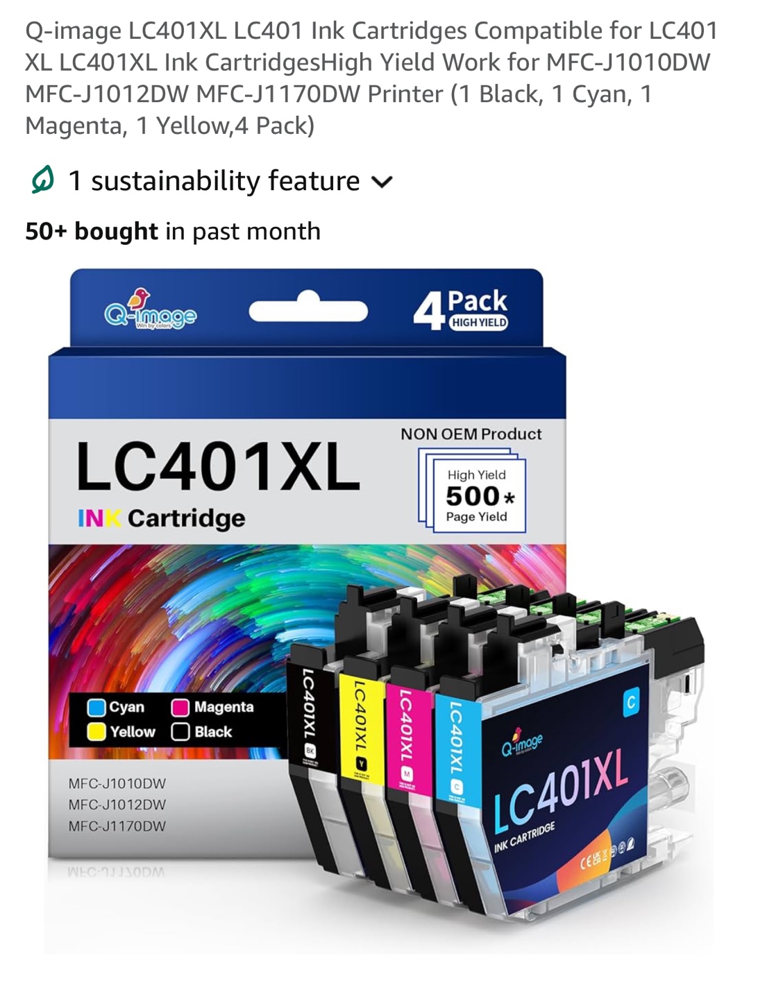 4-pack of Q-image LC401XL high-yield ink cartridges. Compatible with MFC-J1010DW, MFC-J1012DW, and MFC-J1170DW printers. Includes black, cyan, magenta, and yellow.