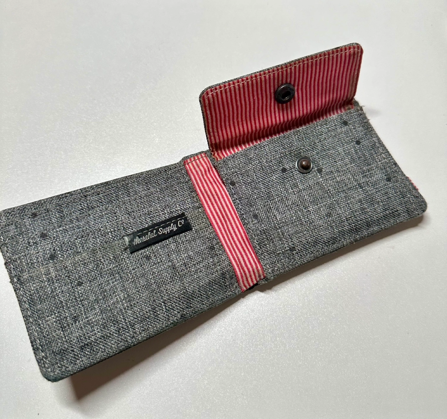 Grey speckled fabric bi-fold wallet. Red and white striped interior. Compact design. Excellent condition. Comes in original packaging.
