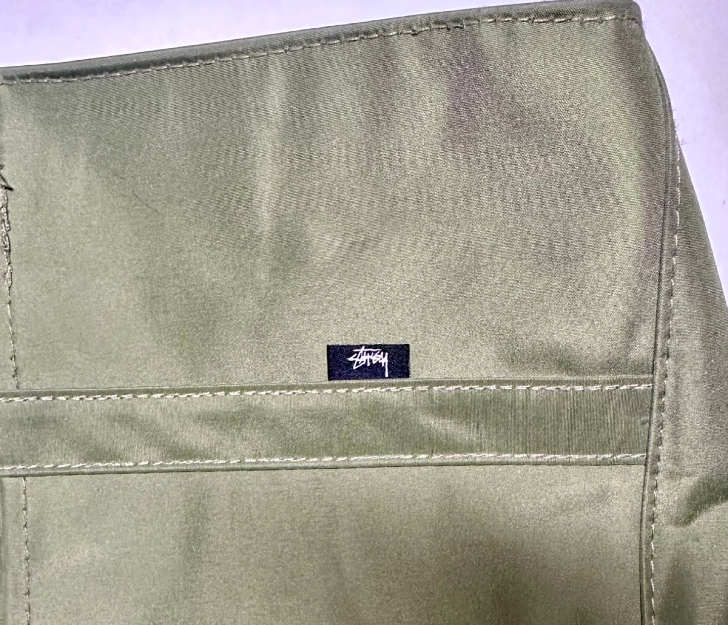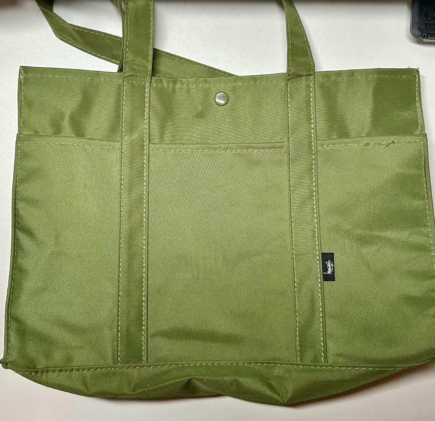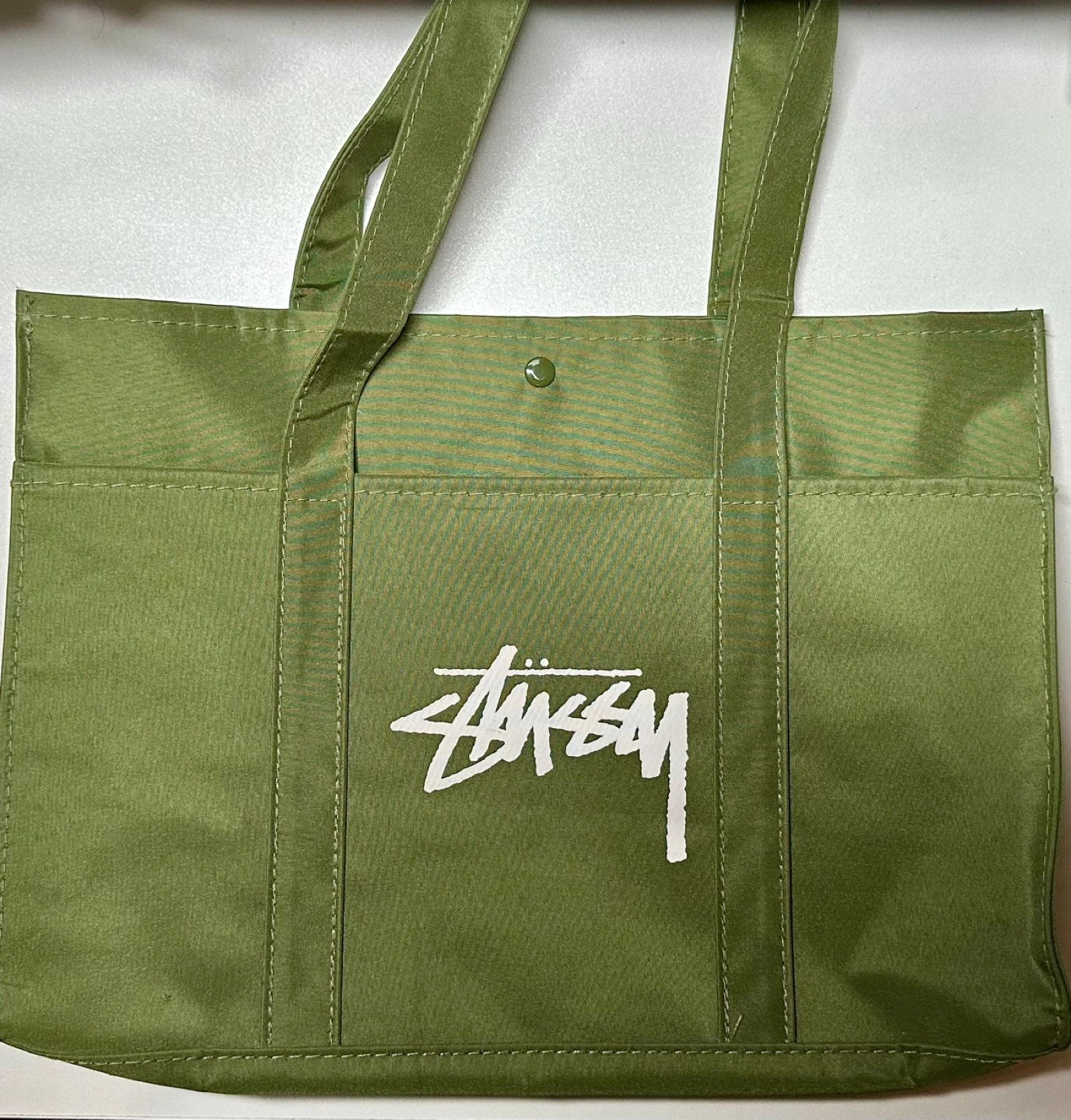Stüssy branded tote bag. Olive green colour. Features multiple pockets and sturdy handles. Perfect for everyday use. Size about 12.5 in x 9 in x 3 in BAG ONLY