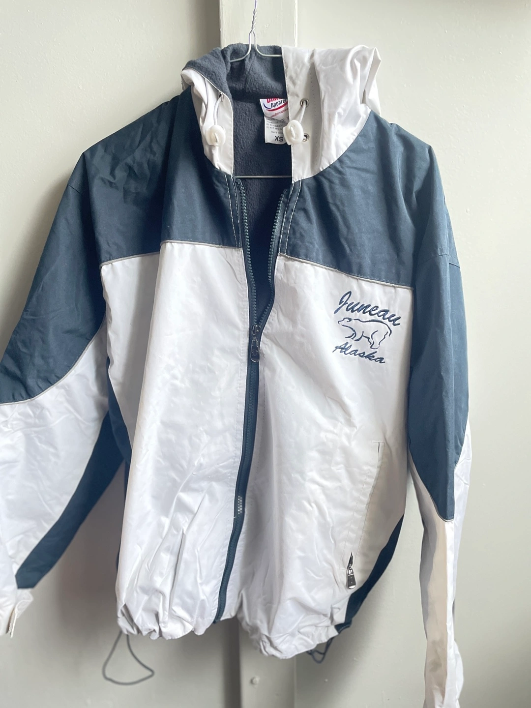 White and black windbreaker. Features a drawstring waist and hood. Juneau Alaska embroidery on the front.