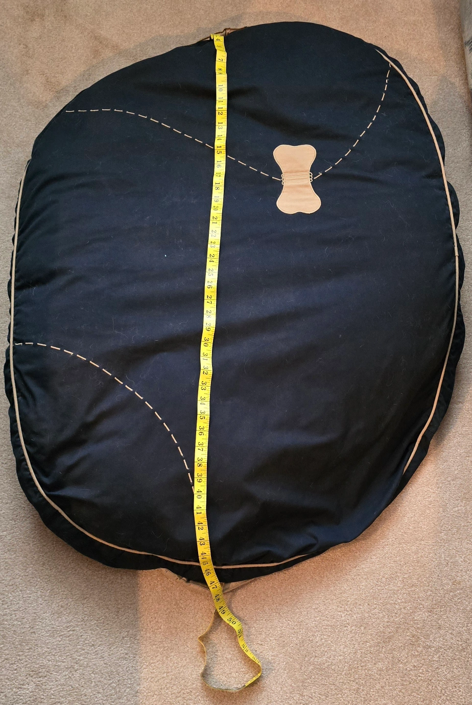 My neighbour asked me to sell her dogs oval dog bed. Thick navy blue fabric with tan accents. Measures approximately 34x47 inches. She's going to get it cleaned this will be ready this weekend. Good condition.