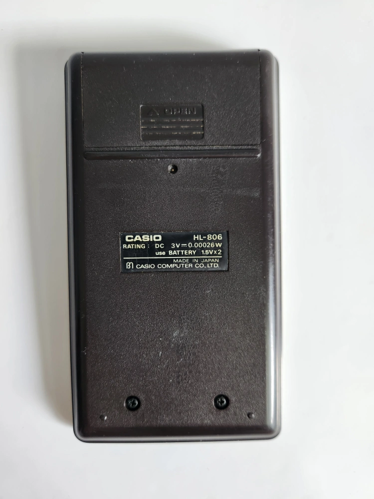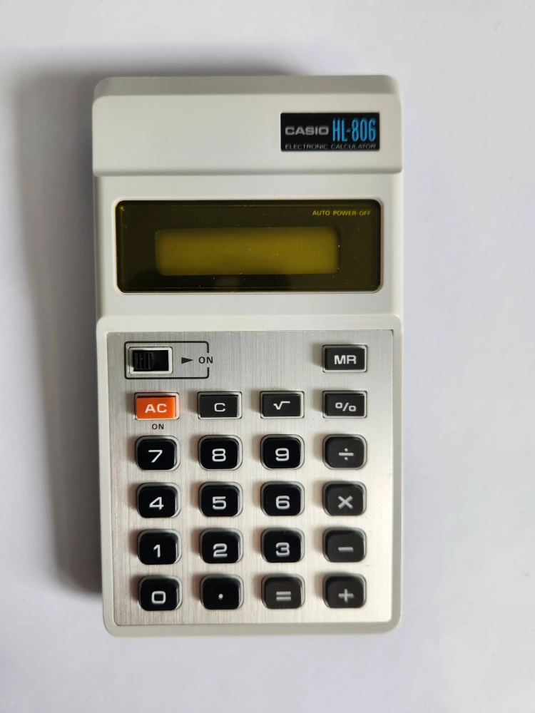 Vintage Casio HL-806 electronic calculator. Auto power off feature. Compact size. Good condition, some minor wear.