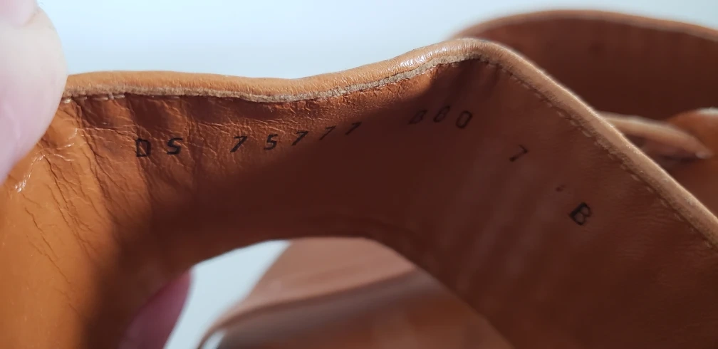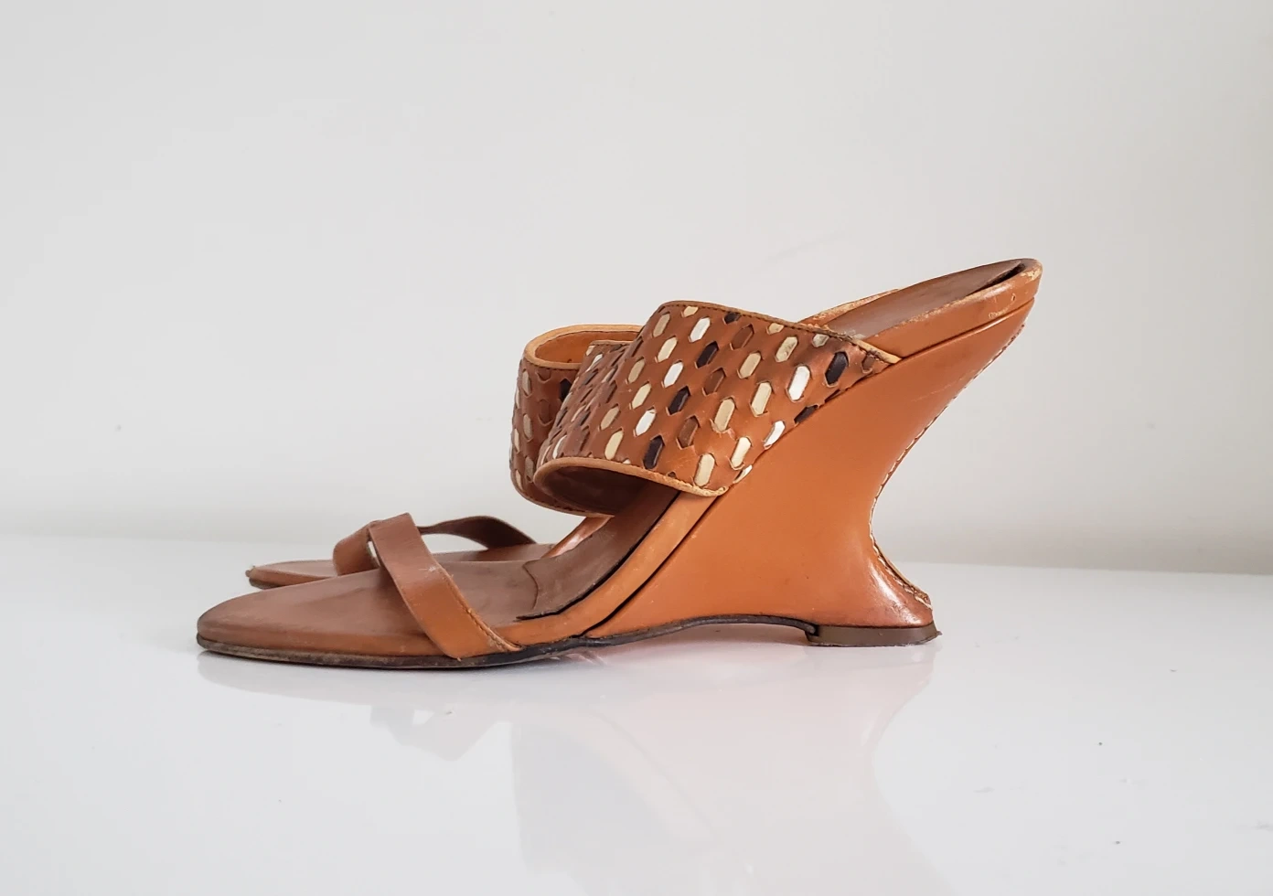 Well-worn, vintage Ferragamo wedge sandals. Camel colour leather, woven white, camel, black strap. Size 7.