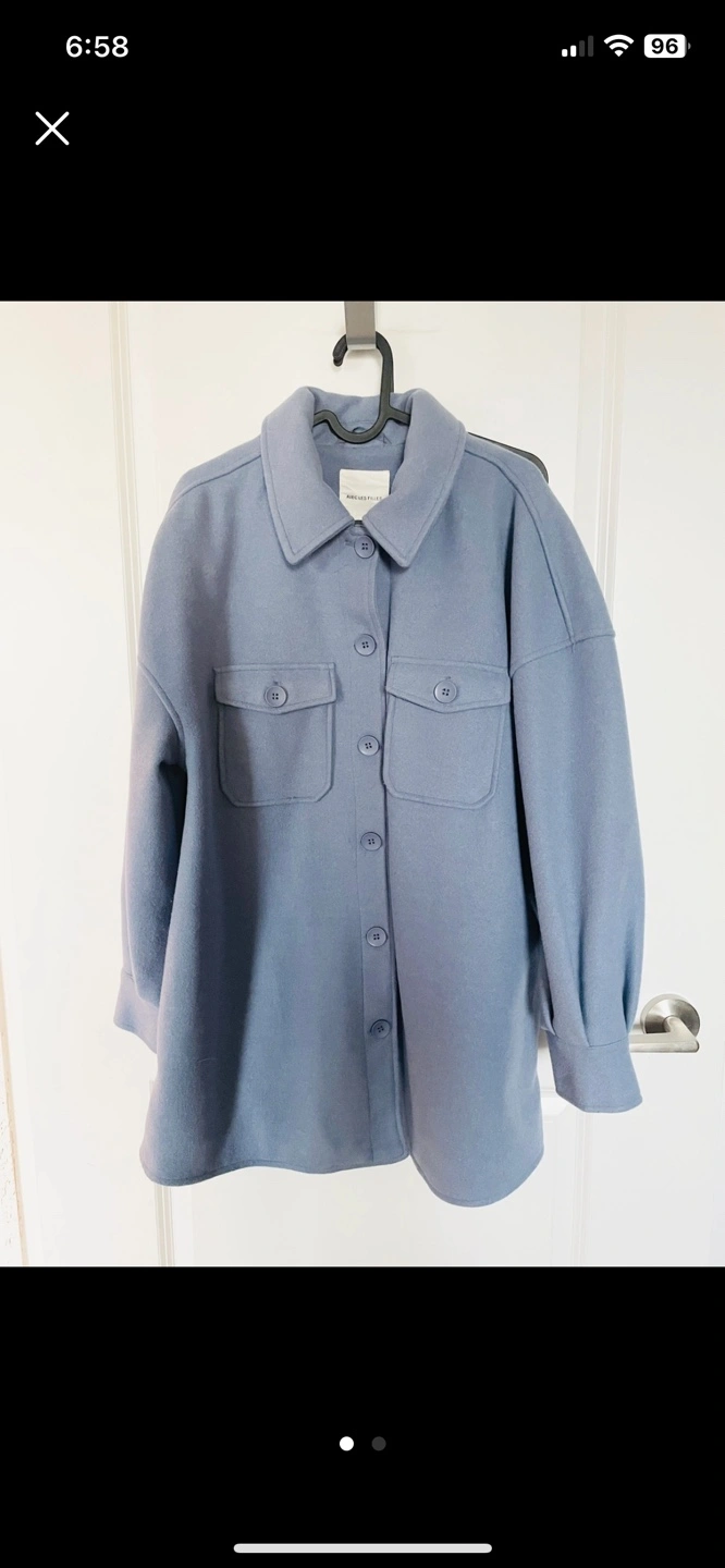A beautiful sky blue jacket with a button-up front. No discoloration, brand new. high quality material. Never worn, too big for me. It has two large flap pockets on the front. The sleeves have a cute puffed look. The fabric feels like good wool and warm.