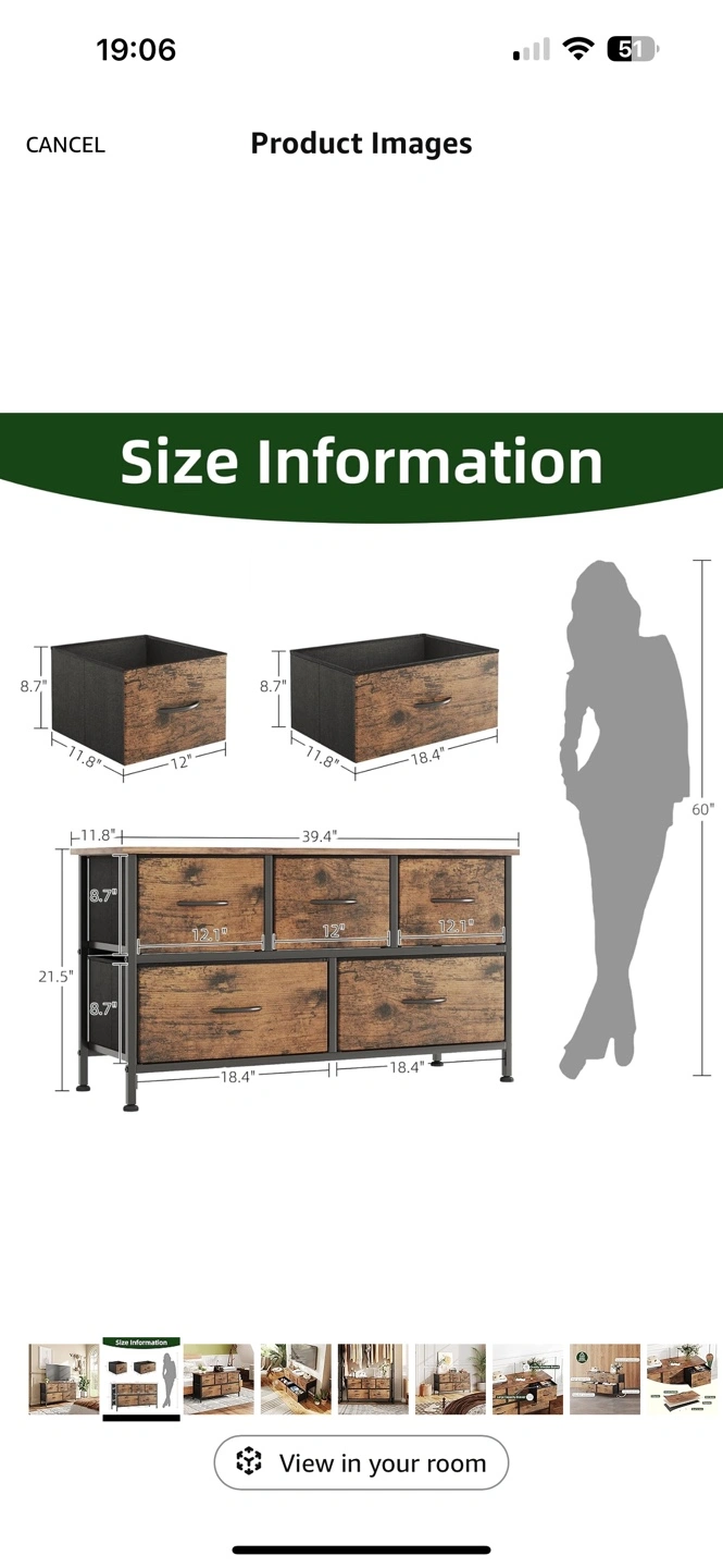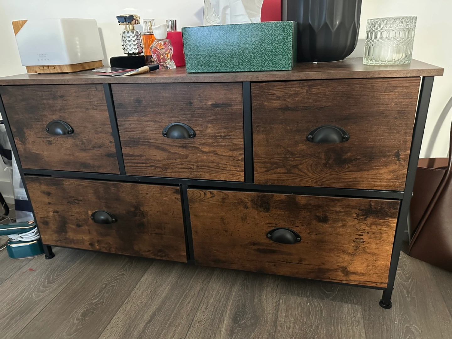 Five-drawer storage unit. Dark brown wood finish with black metal frame. Fabric drawer liners included. Great for organizing smaller items.