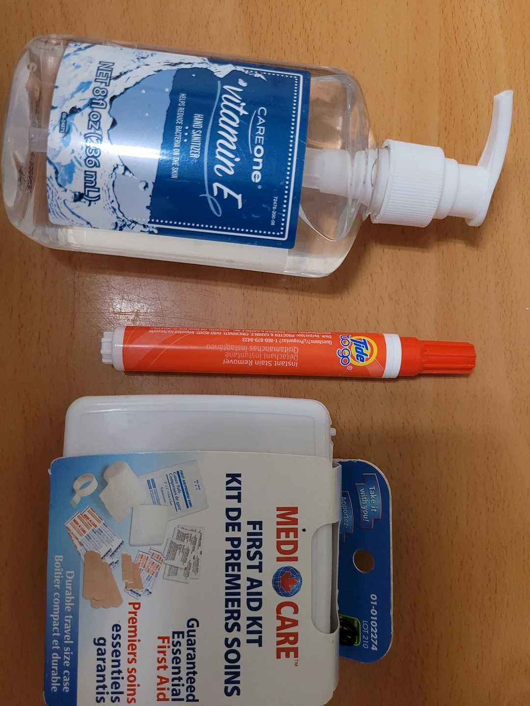 ** Tide stain remover pen is full** ** Sanitizer bottle, never used** ** First Aid kit still sealed**o