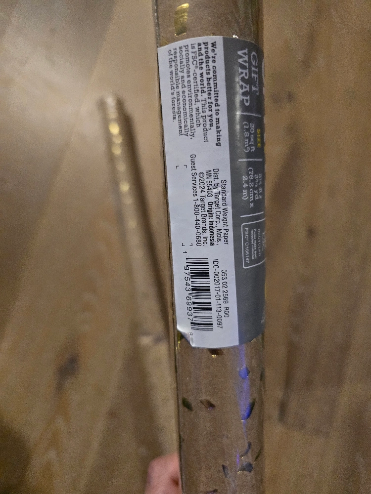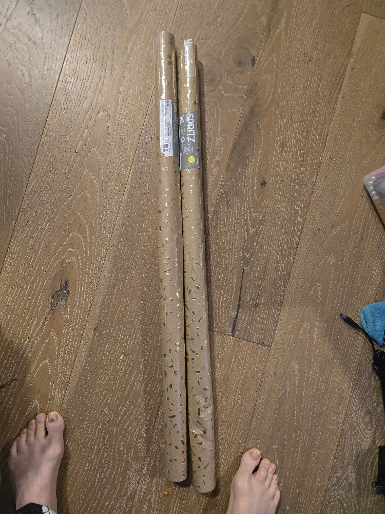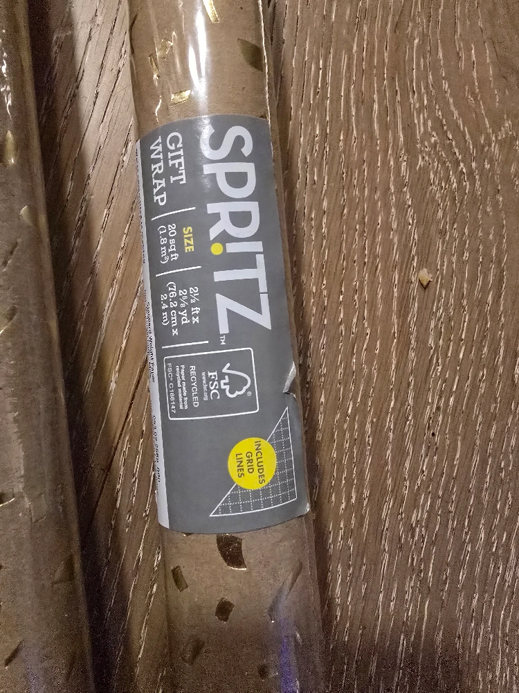 Two rolls of Spritz brand gift wrap. Kraft paper with gold confetti pattern. Perfect for gifts.