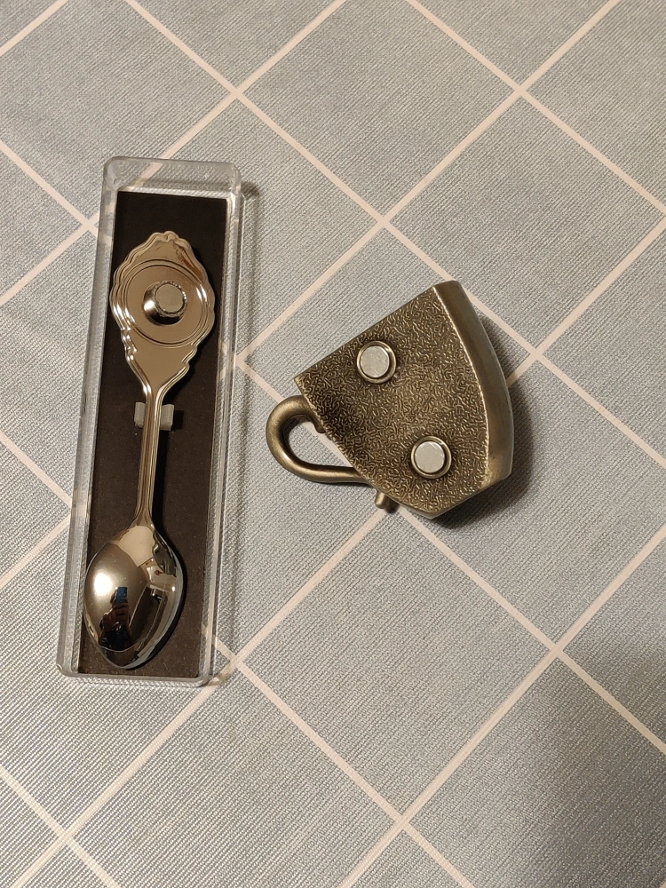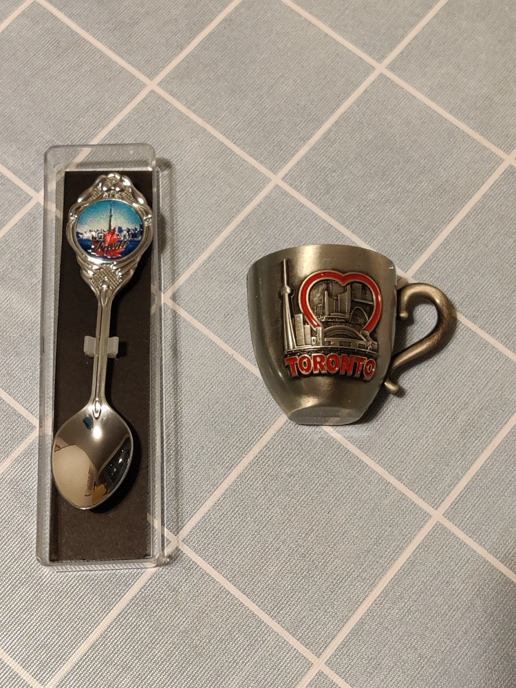 Collectible Toronto souvenir set. Includes a small spoon and a miniature magnet cup. Both feature Toronto imagery. Great for collectors or tourists.