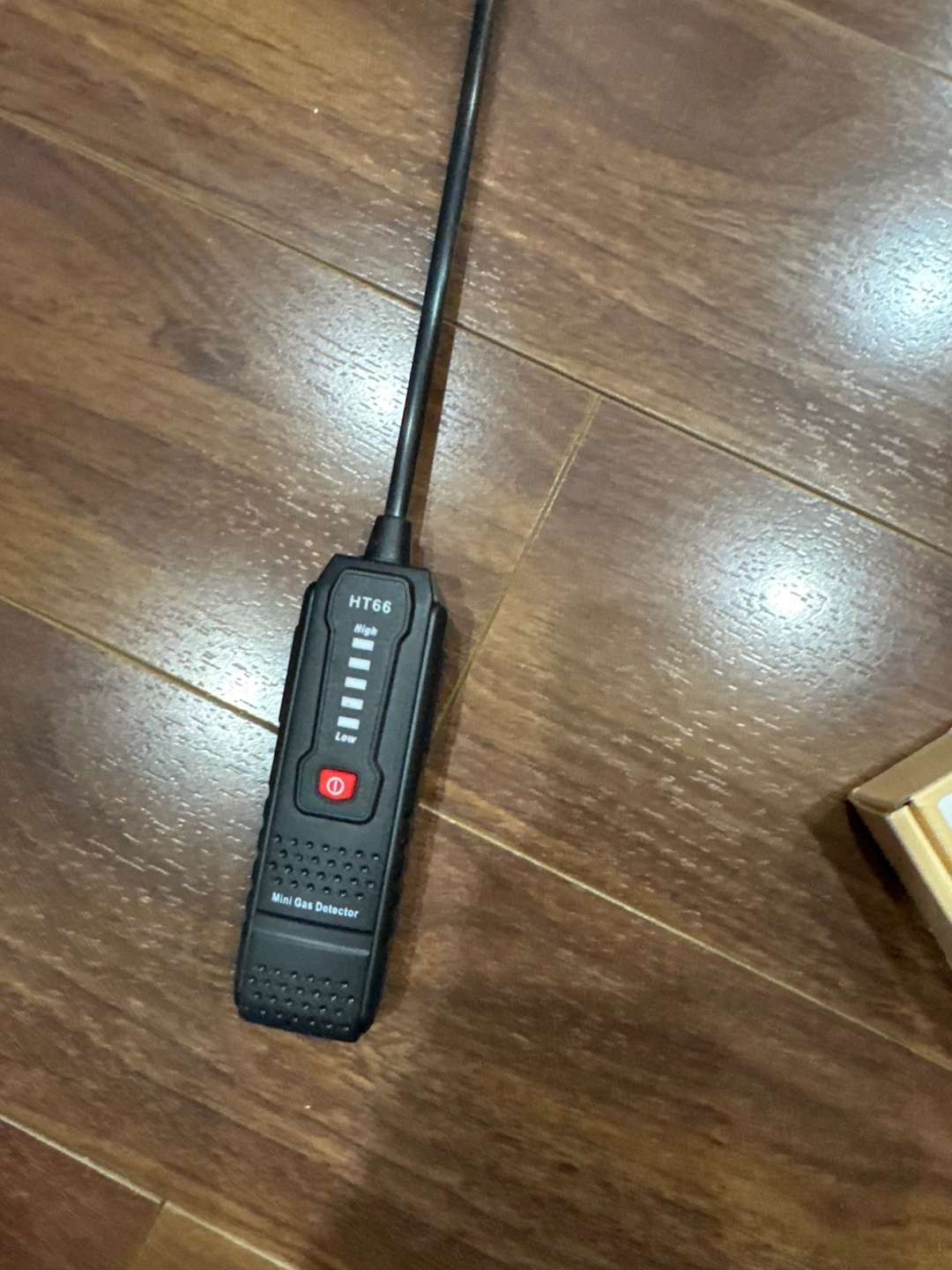 Portable gas leak detector. Features a long probe and LED indicator lights. Easy to use.