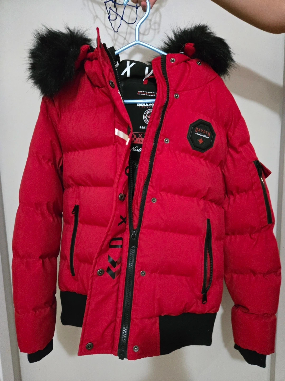 Selling a vibrant red Oxygen puffer jacket! It's in great shape and ready to keep you warm this winter. The jacket features a faux fur-trimmed hood and a stylish design. Perfect for those chilly Canadian days!