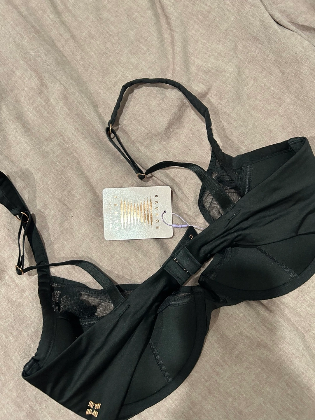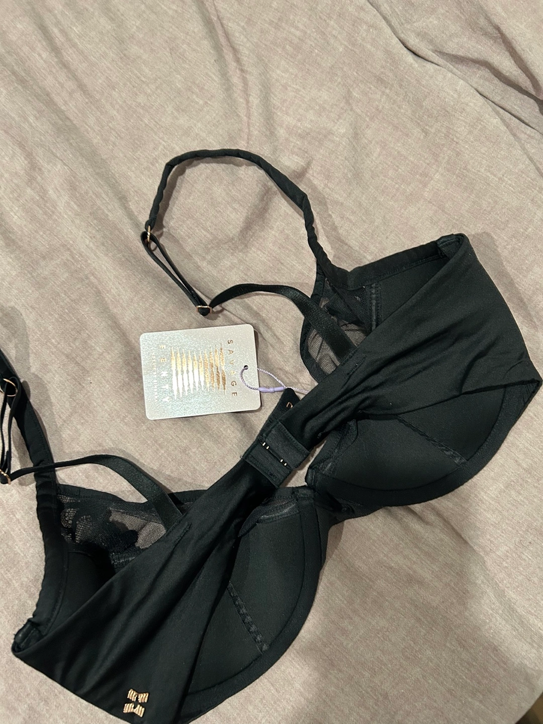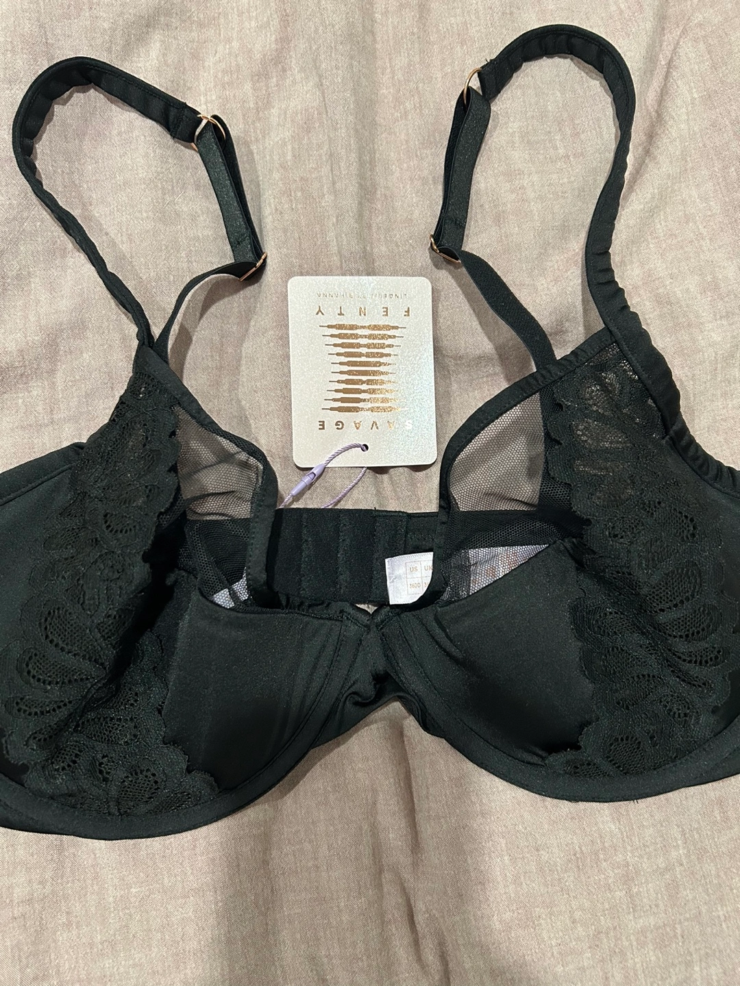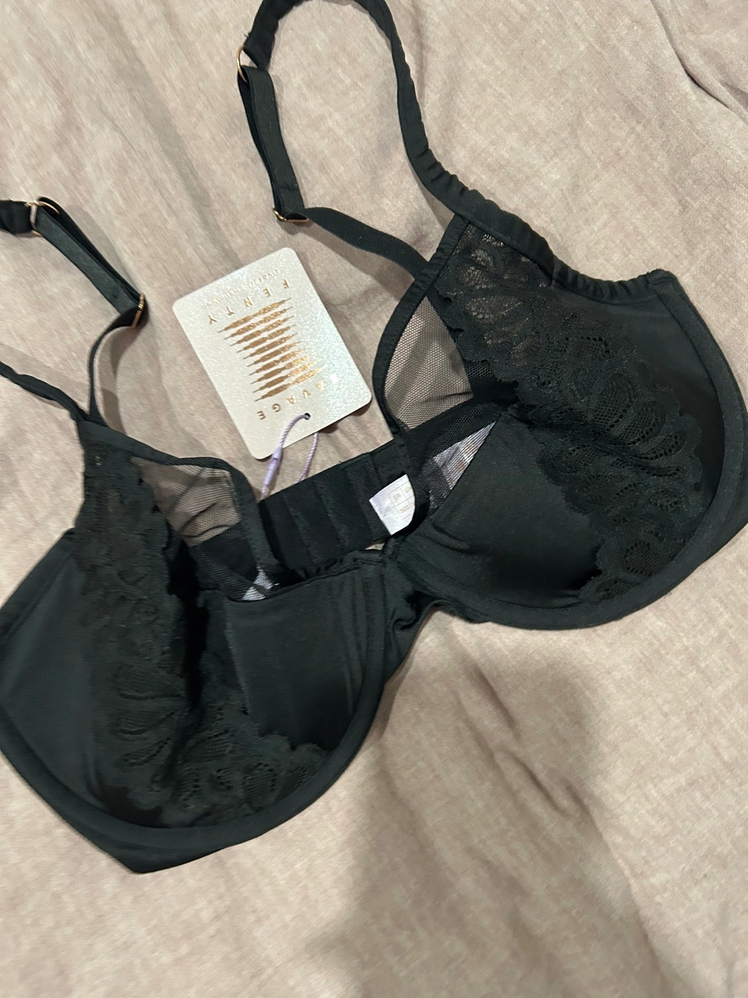 Black unlined bra. Features sheer mesh and lace detailing. Adjustable straps and hook-and-eye closure. New with tags.