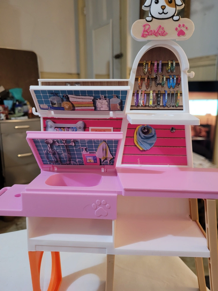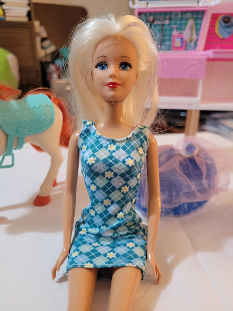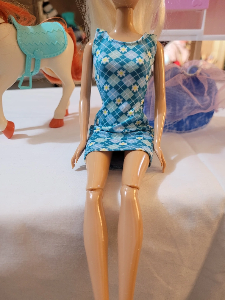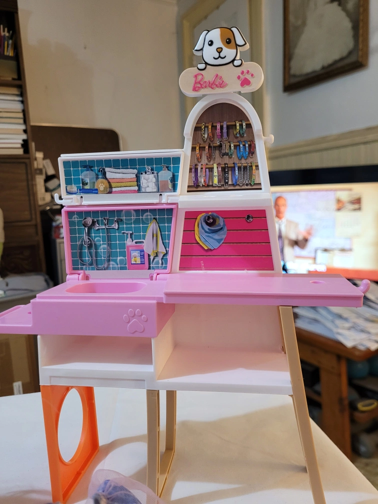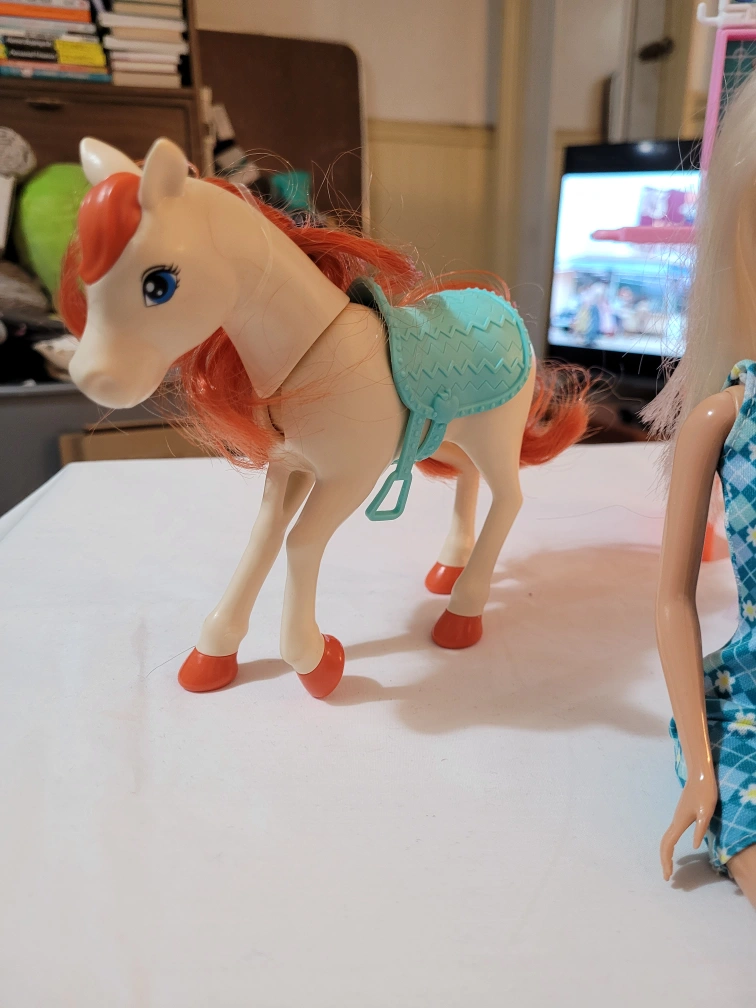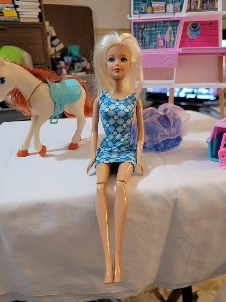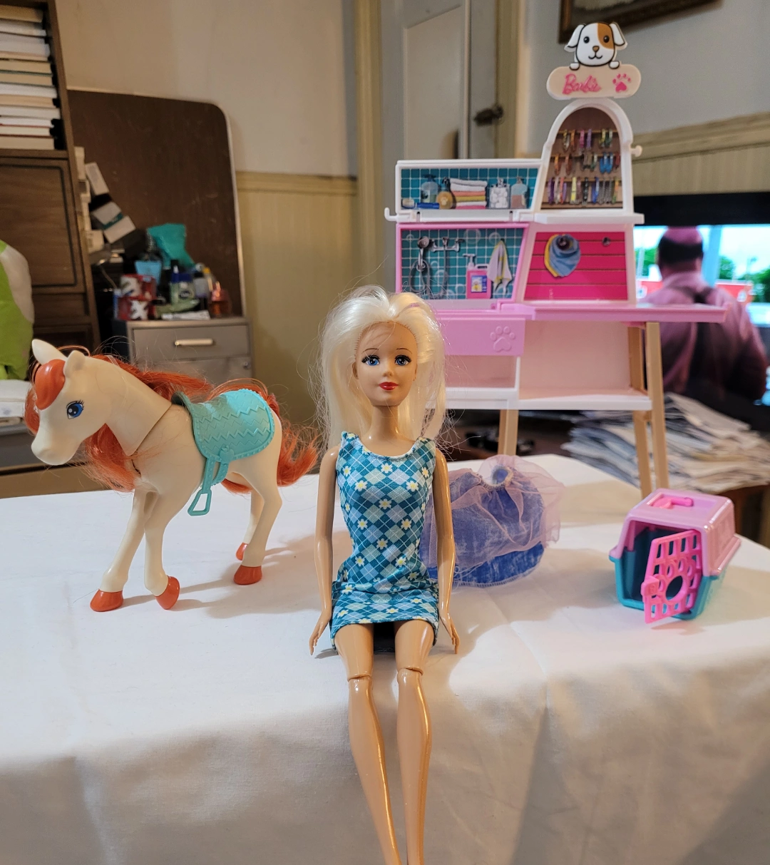 Unbranded articulated barbie-like doll, horse, pet carrier, and vet playset. Great for imaginative play. Also includes skirt for doll to change into.