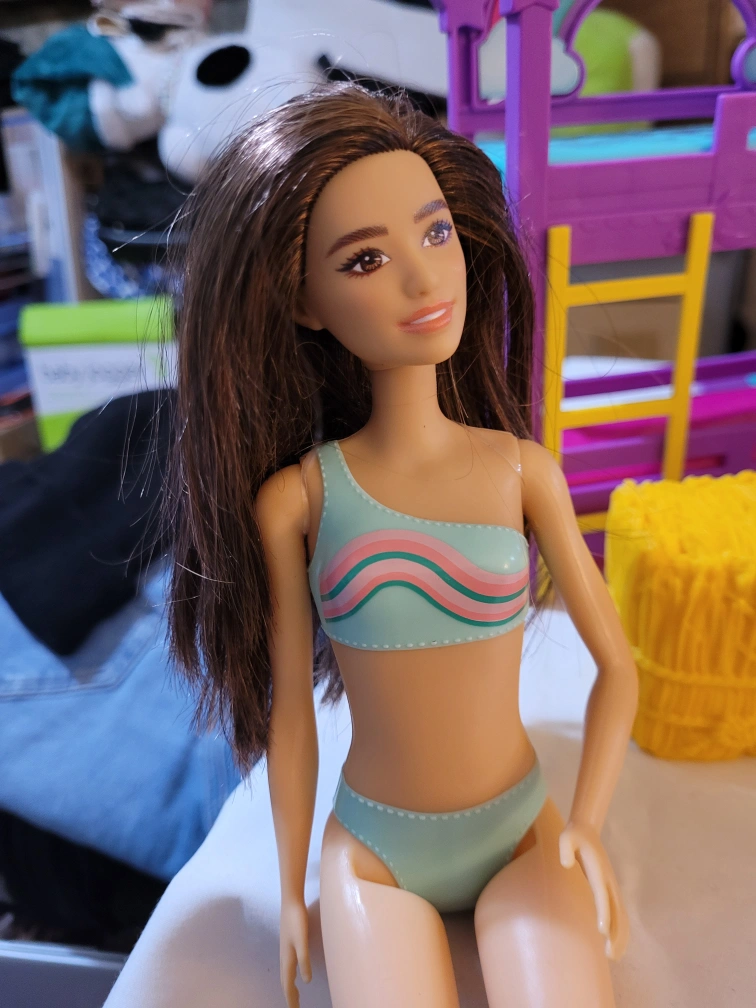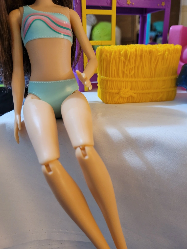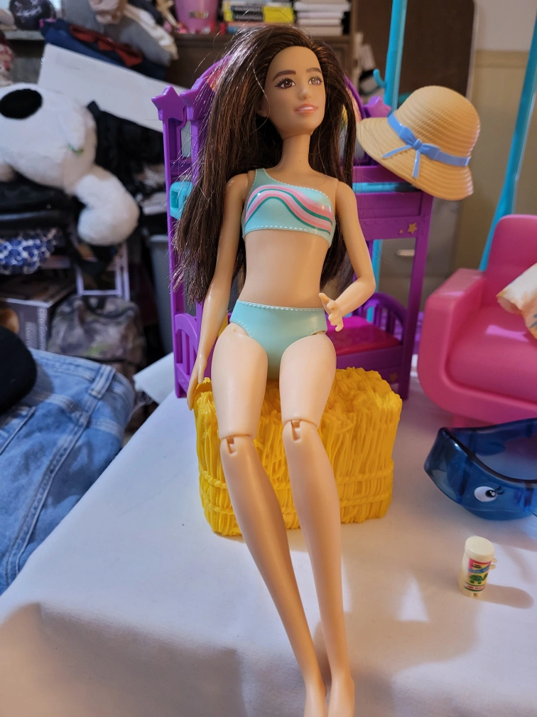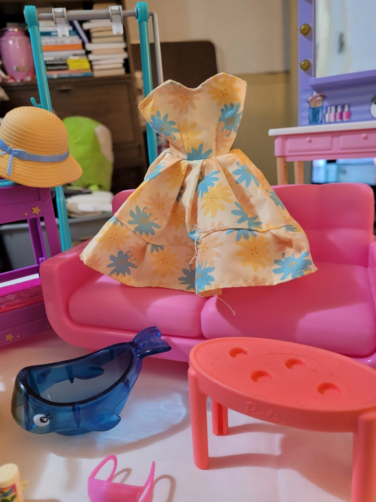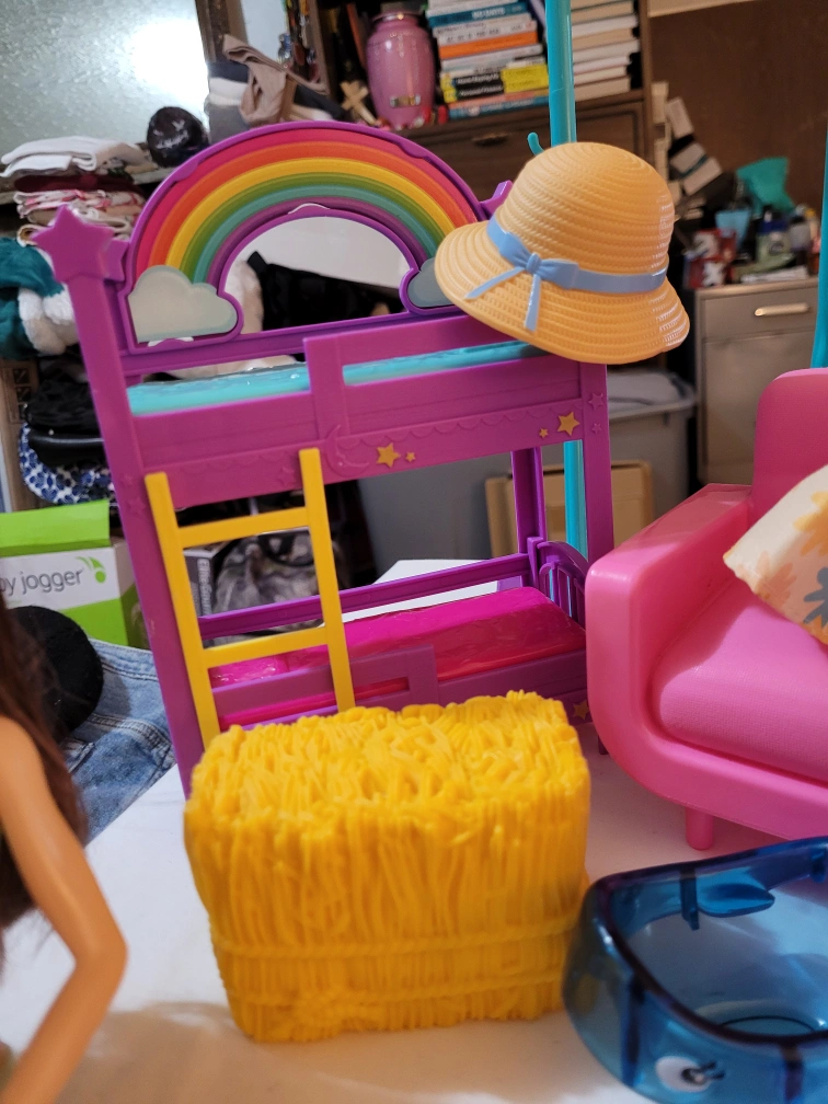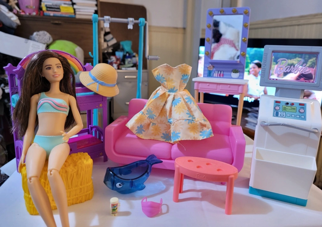 Barbie doll playset includes a bunk bed, vanity with mirror, sofa, small table, and various accessories. Doll included, wearing a swimsuit. Other accessories include a straw hat and a floral dress. Some minor wear possible.