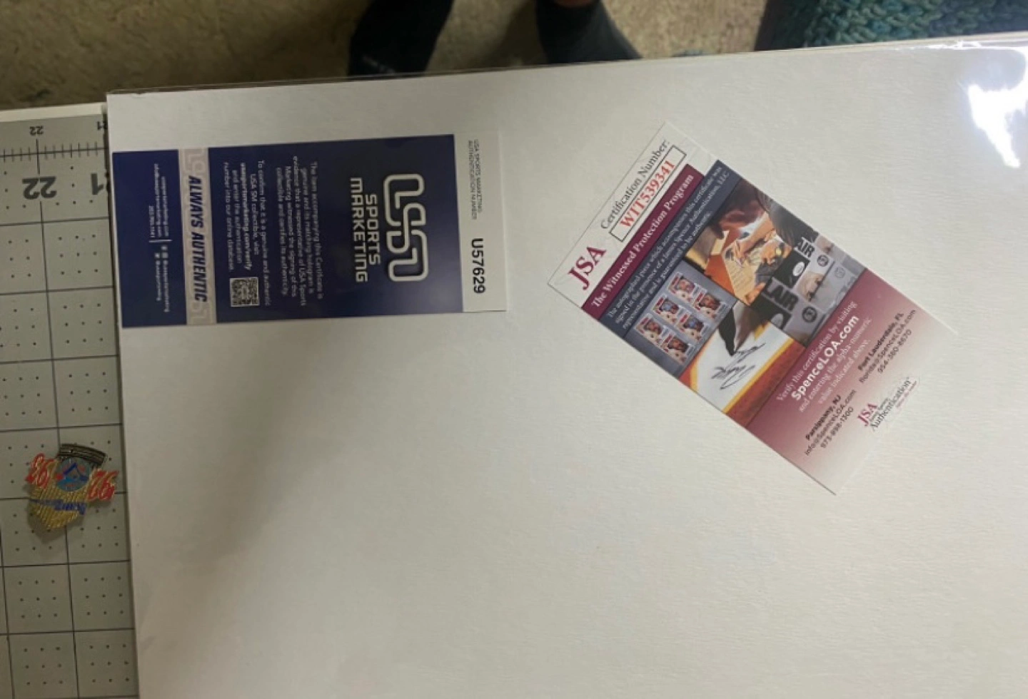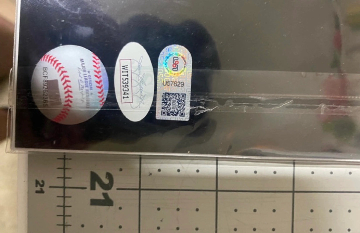 Autographed photo of Teoscar Hernandez, Toronto Blue Jays player. Features a large, clear signature. Includes JSA certificate of authenticity and matching numbered hologram. Excellent condition, still in original plastic sleeve.