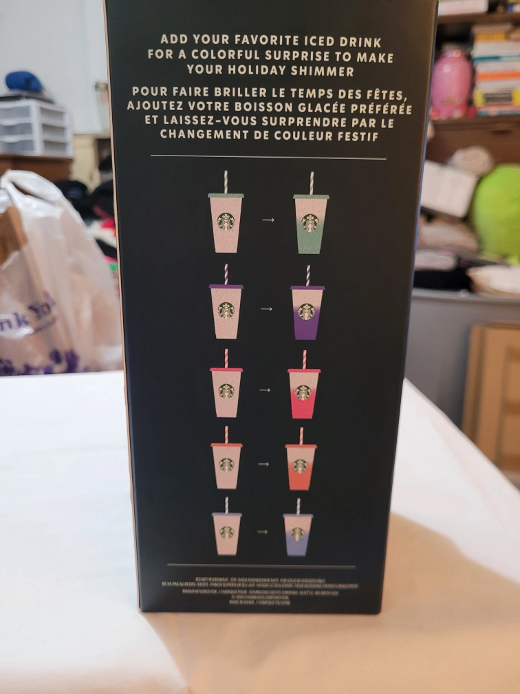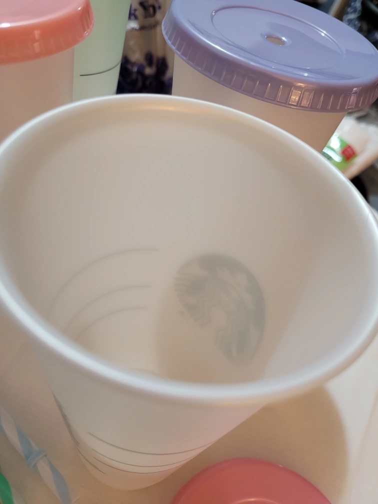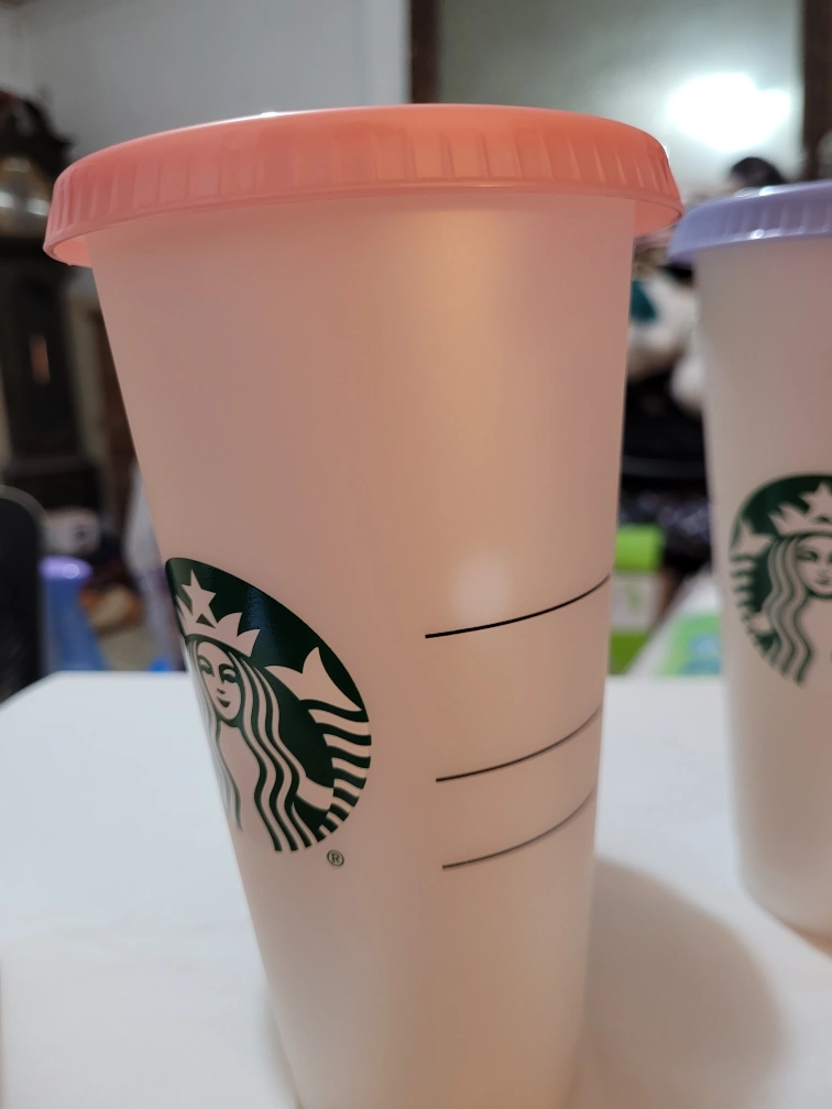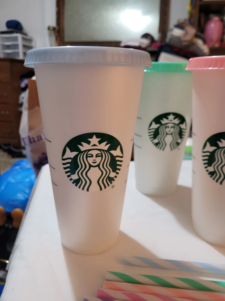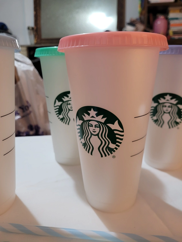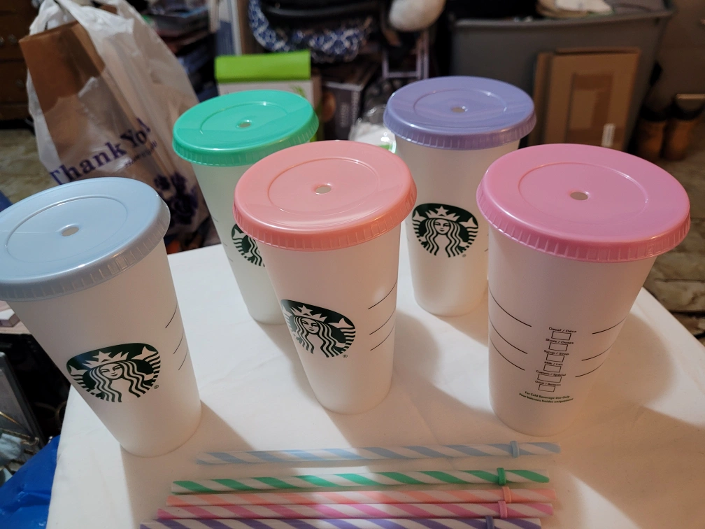Set of five Starbucks reusable cold cups. Pastel color lids. Includes five matching straws. Color-changing design.