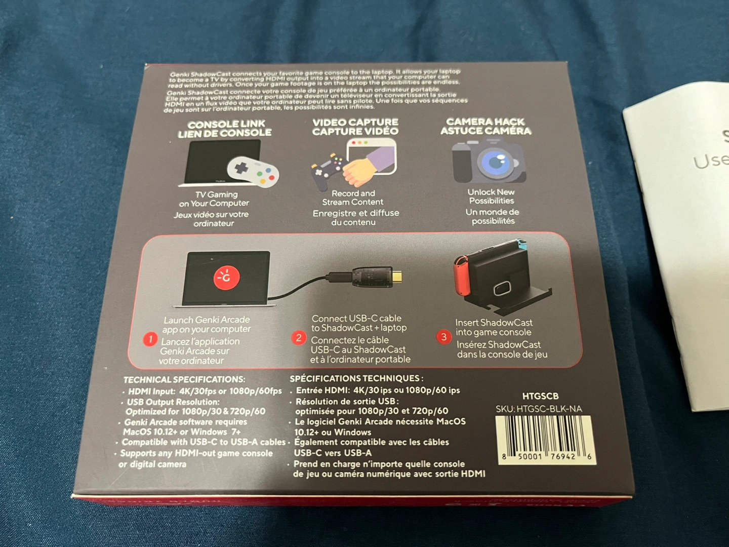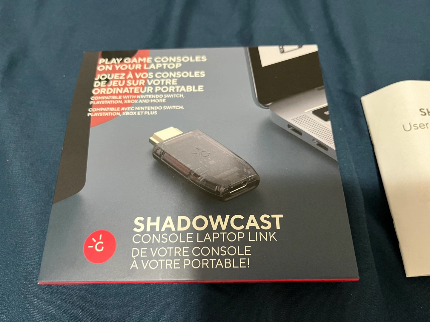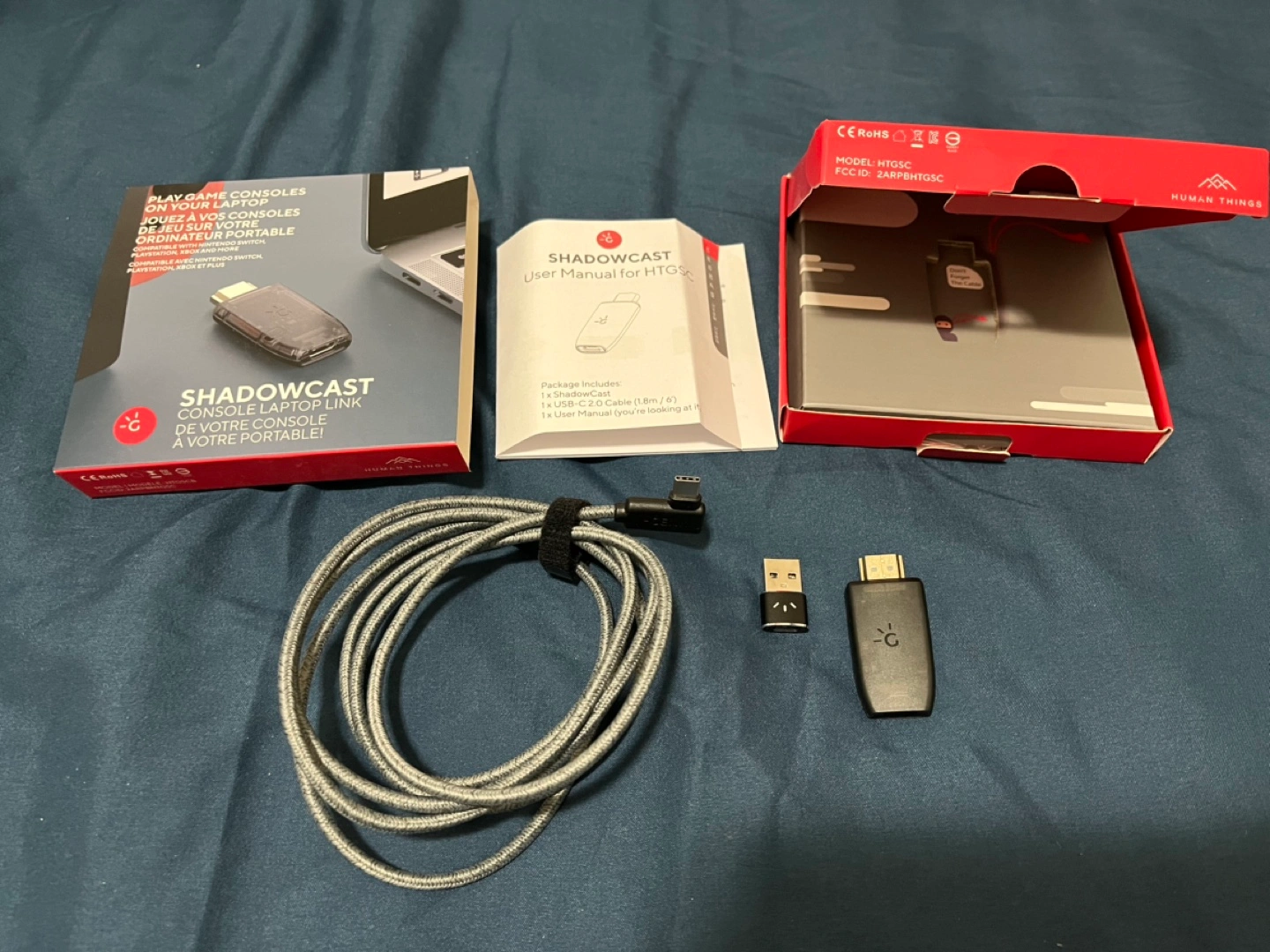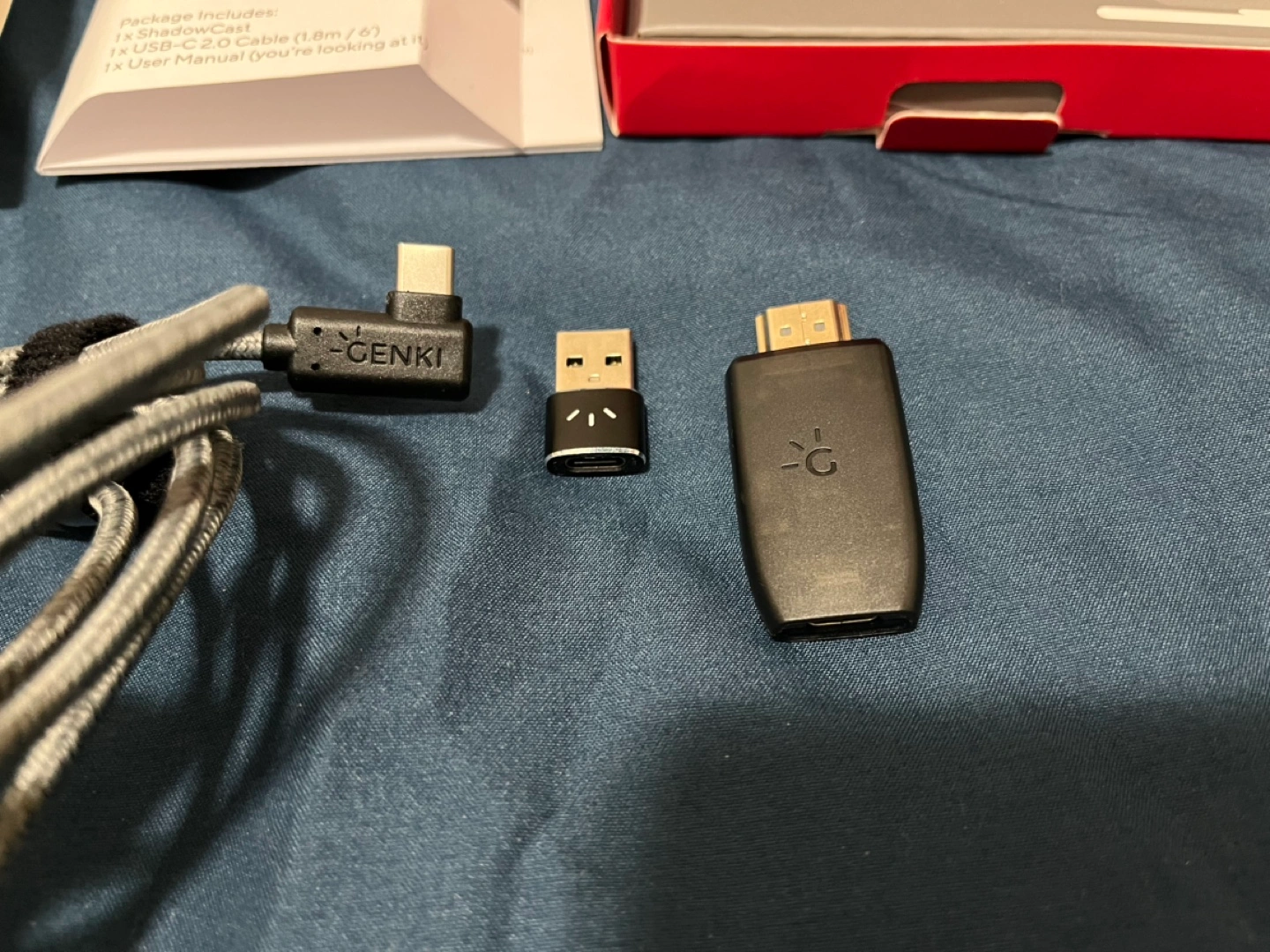 Comes complete as in the photos: Shadowcast device, USB-C cable, USB-C to A adapter, and manual