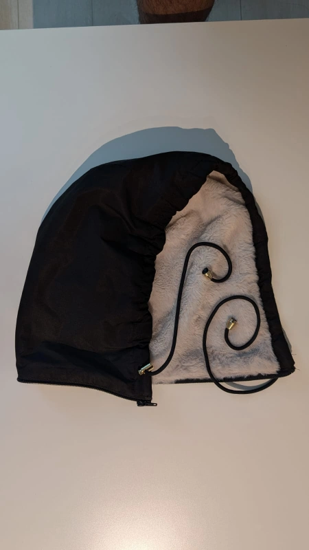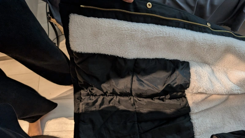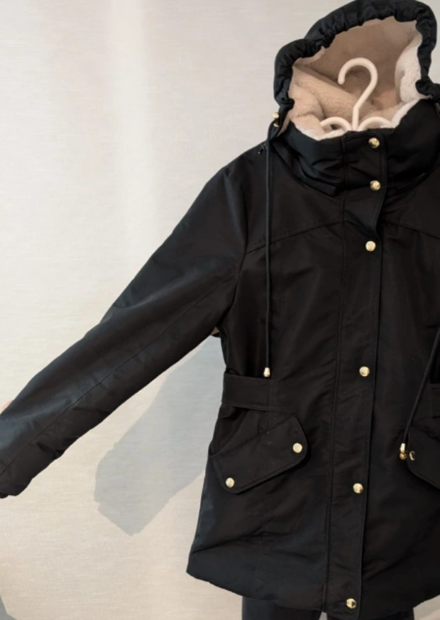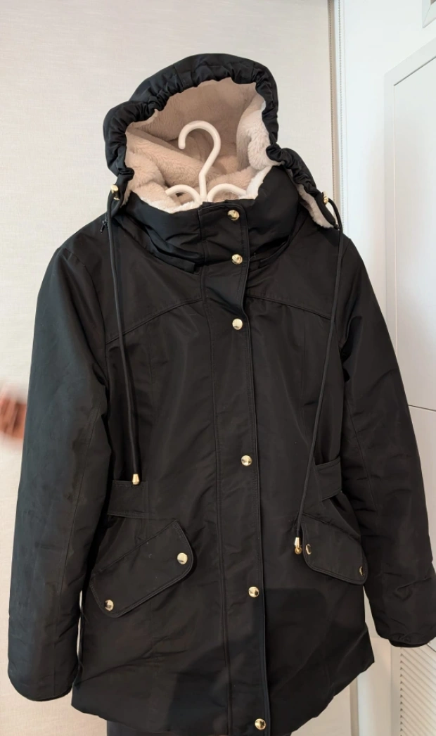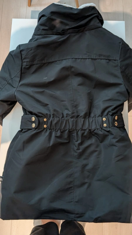 Large Size women 2 months old Moving Sale Warm winter parka. Black, long-length style. Features a detachable head cap. Gold-toned hardware. Sherpa-lined hood. Drawstring waist. Zipper and button closure. Only available for pick up Easily Washable as well