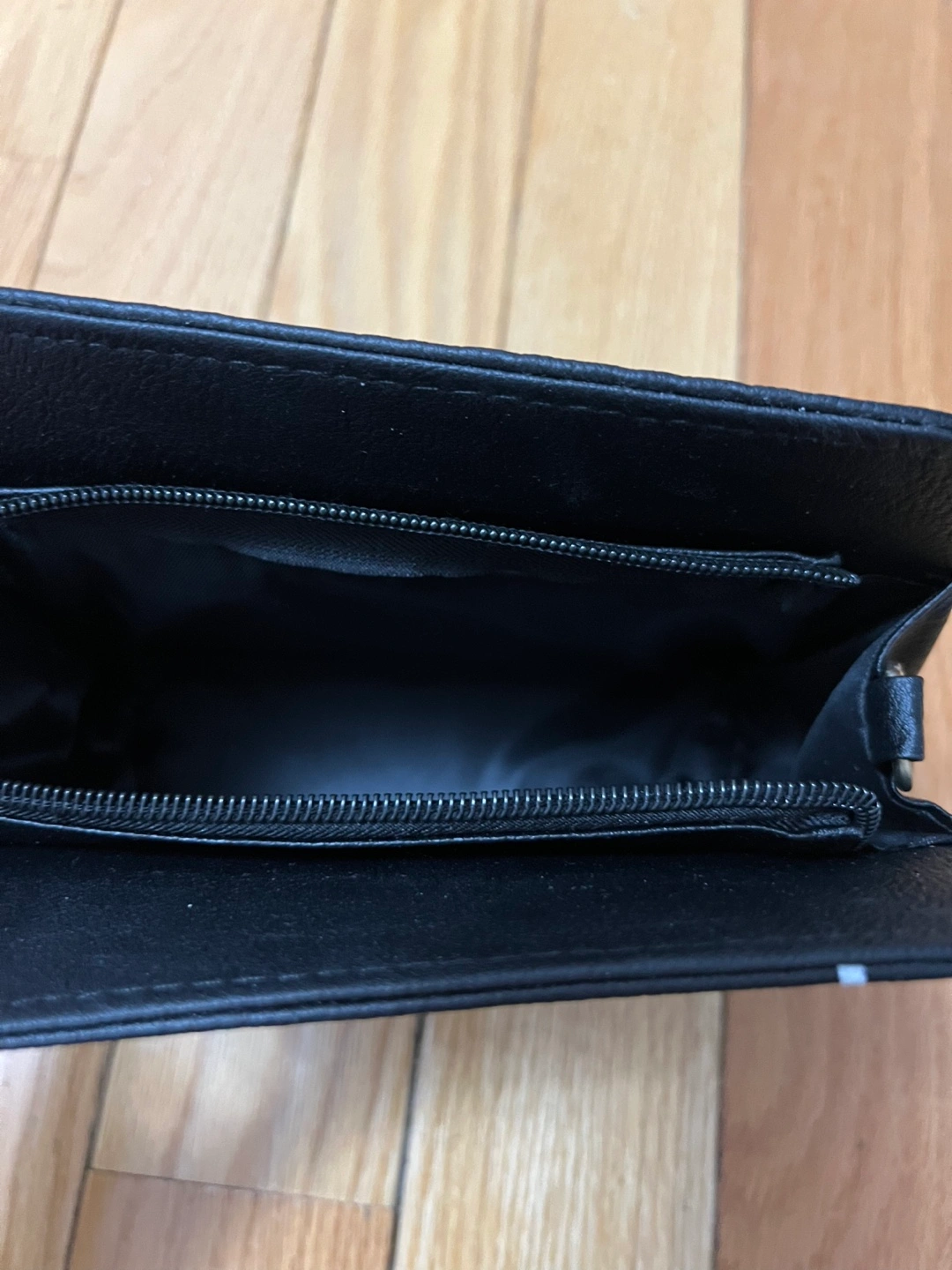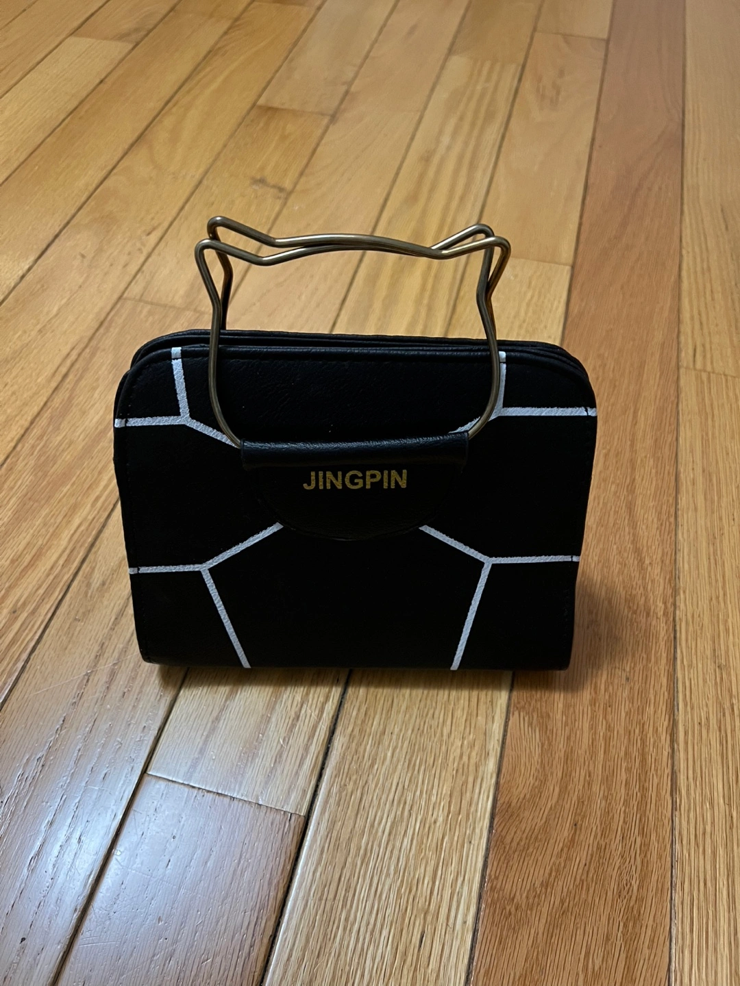 Small black handbag. Geometric white pattern. Unique cat ear shaped handle. Zipper closure. Interior pocket. Great for everyday use.