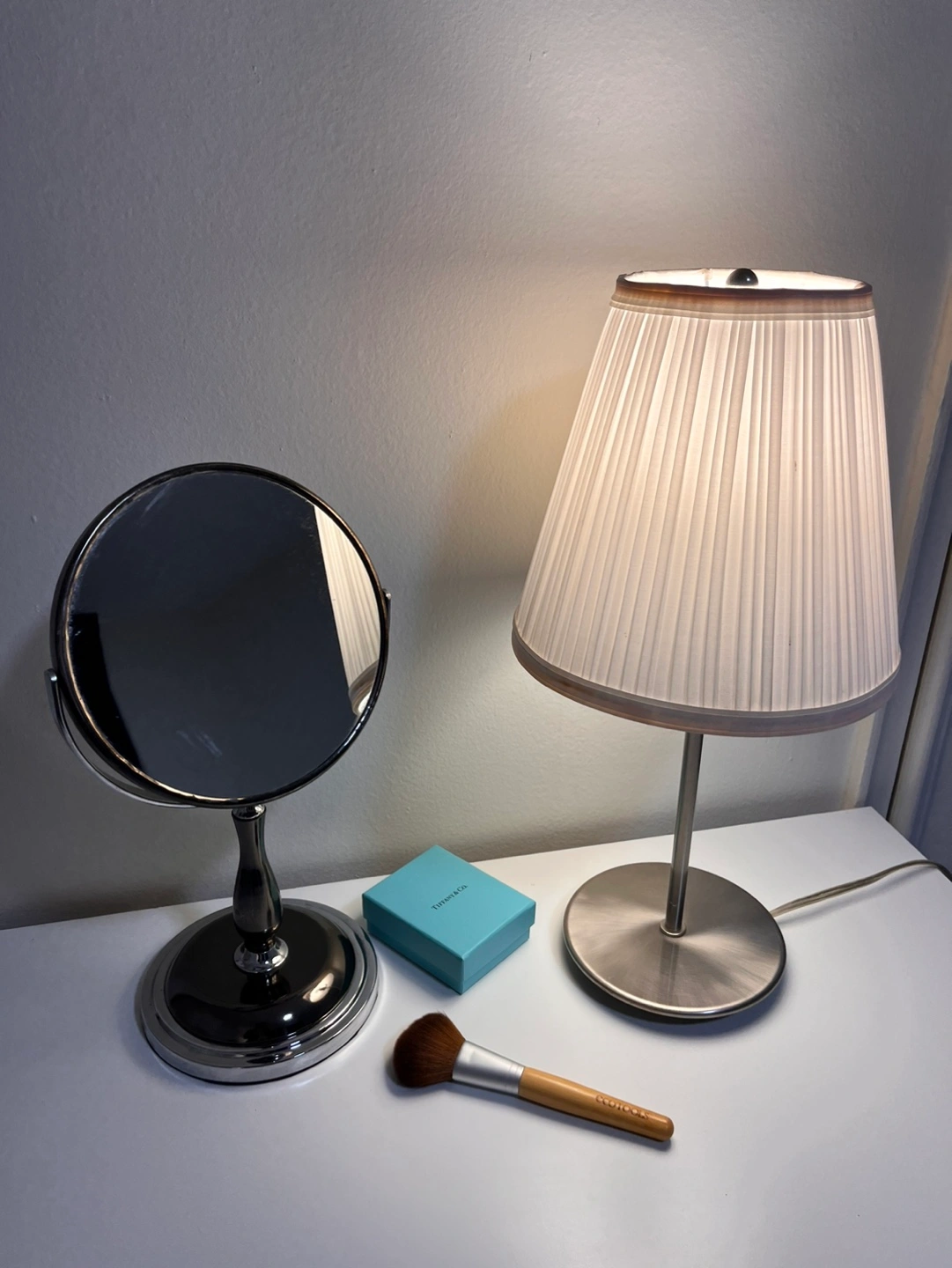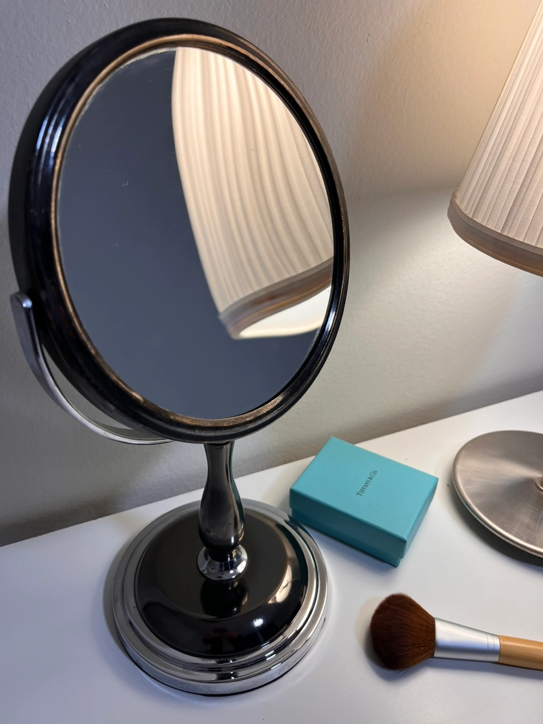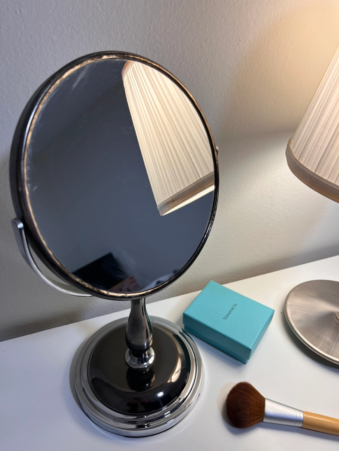 Double-sided vanity mirror. Features a swivel arm with patina with a chrome base. Lamp comes with LED bulb with warm soft light. 💡 Price is for both together.