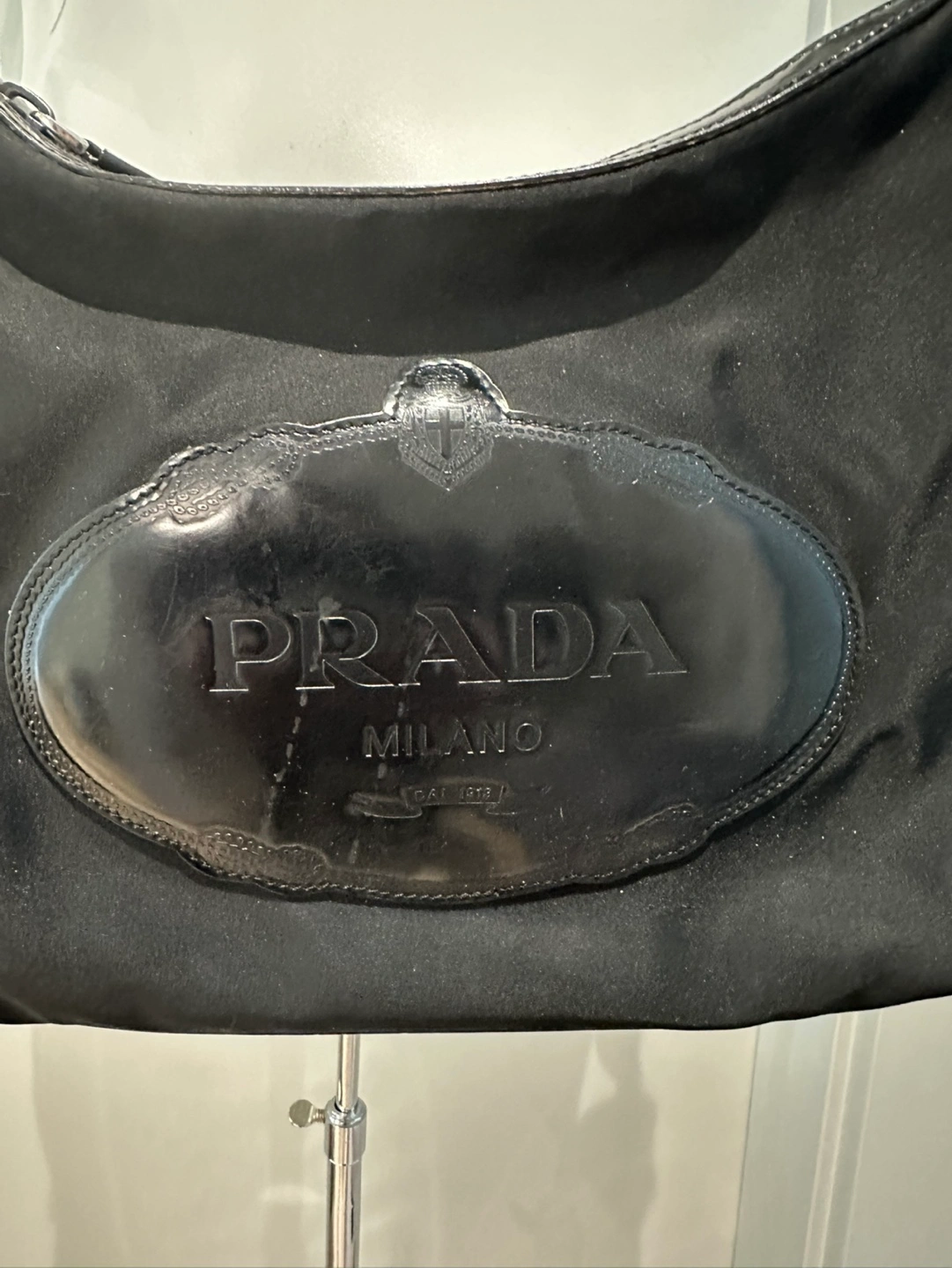 Pre-owned Prada shoulder bag. Black nylon material with leather accents. Features a signature Prada logo plaque. Silver-toned hardware. Single shoulder strap. Minor wear visible.