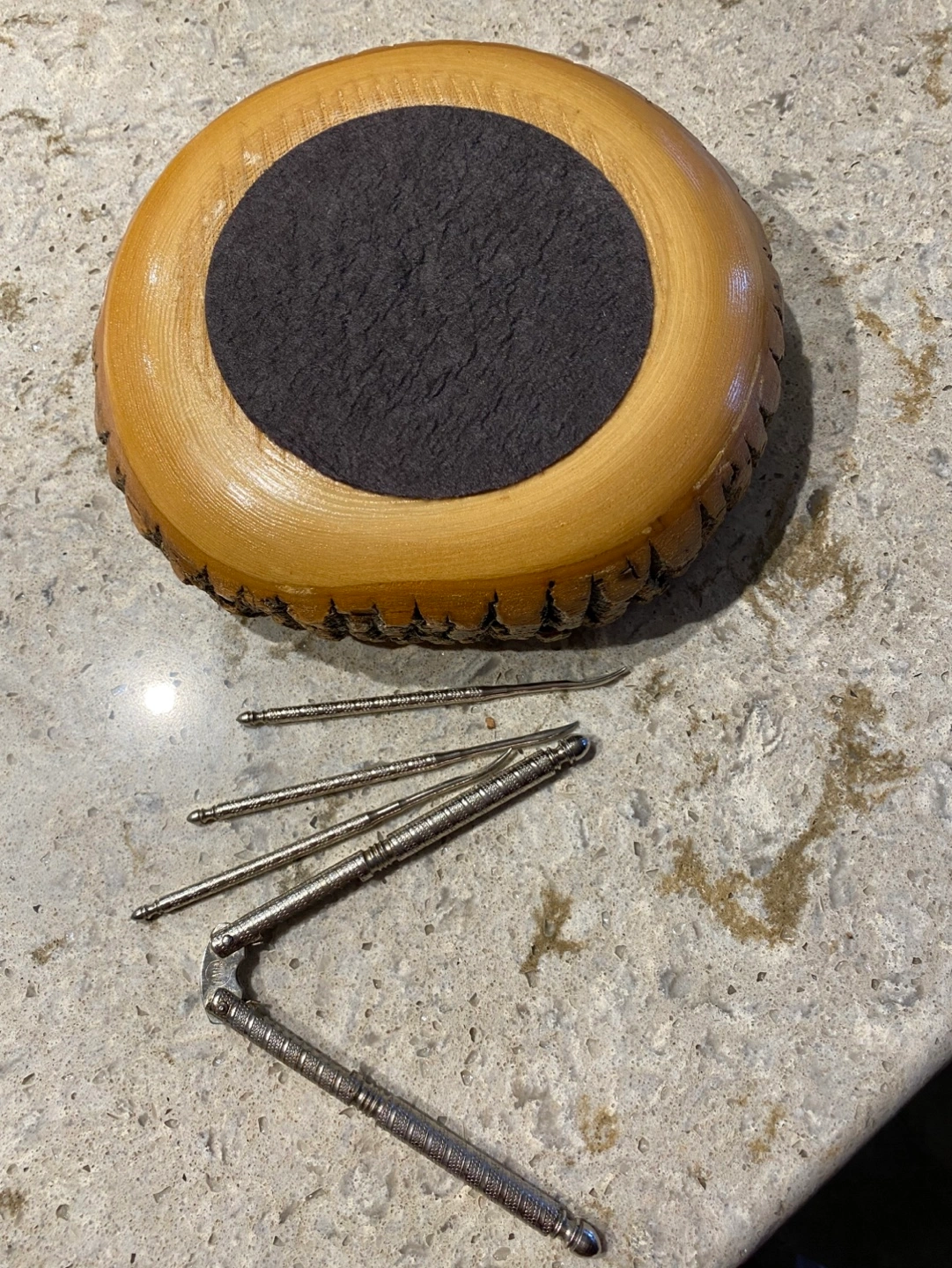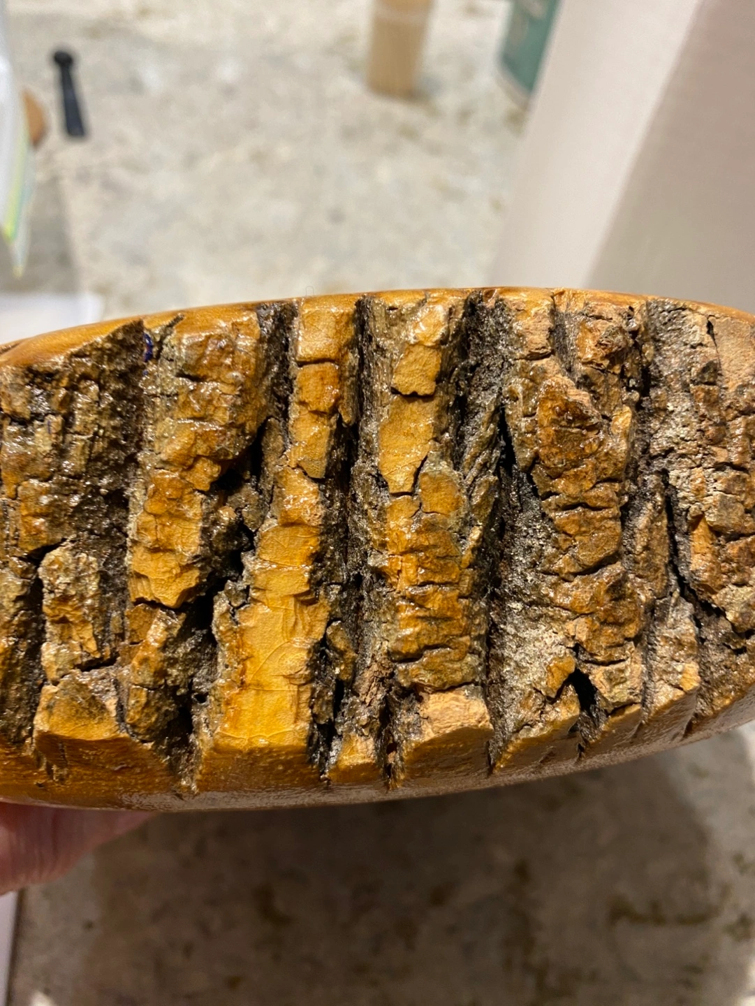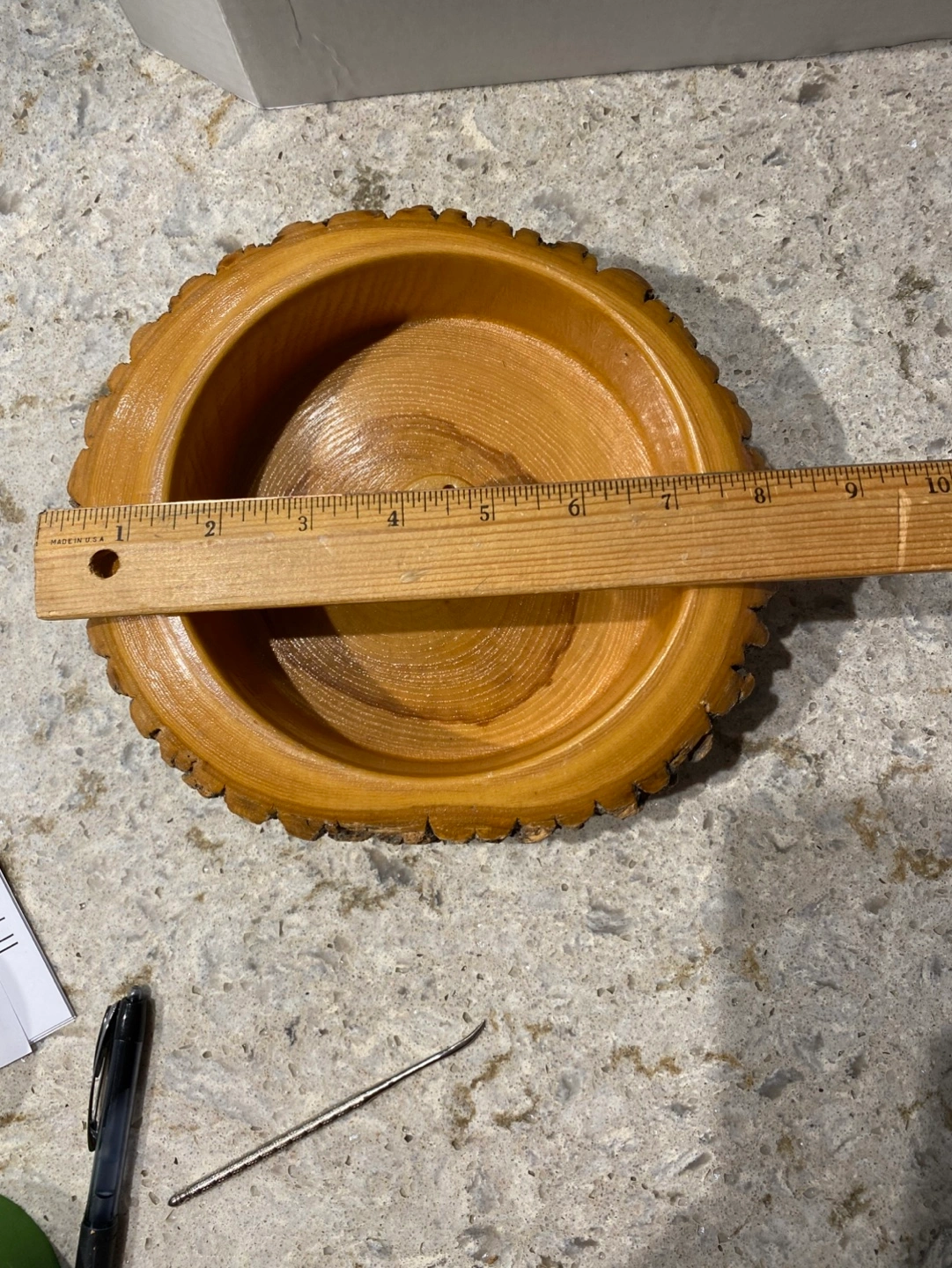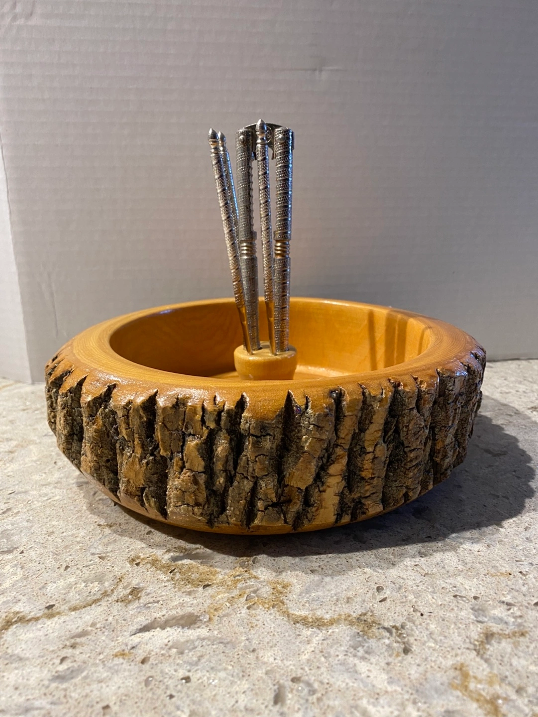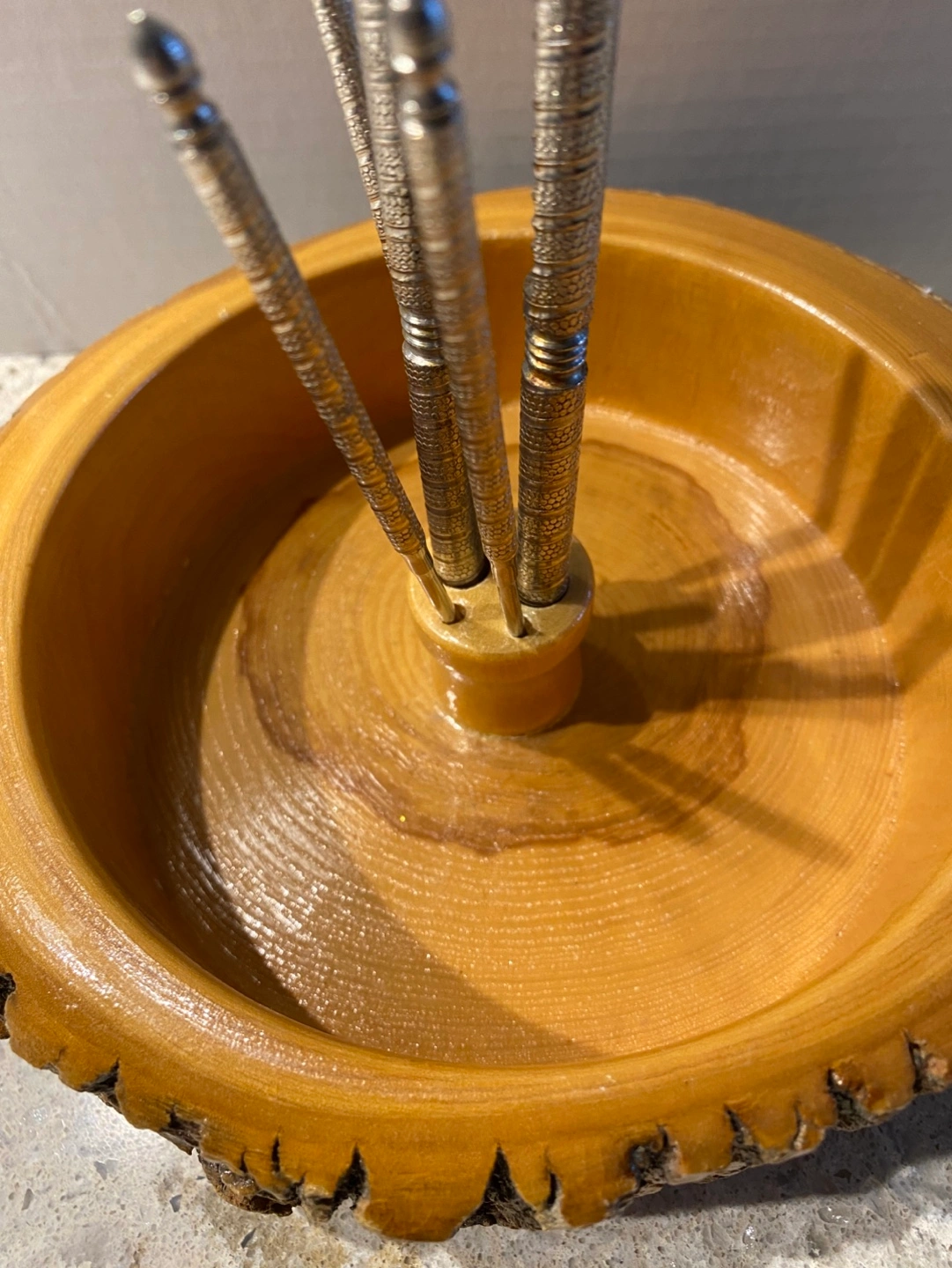 Vintage bark edge wooden nutcracker bowl. Features four picks and one cracker. Measures approximately 8 inches in diameter. Add a touch of nature to your table. Pick up in Scenic Acres NW