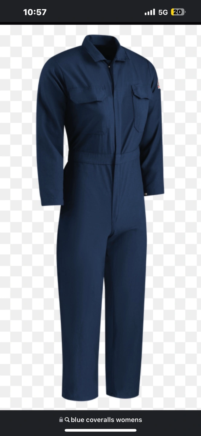 navy blue coveralls. Long sleeves, collared neckline, and multiple pockets. Great for work or casual wear.