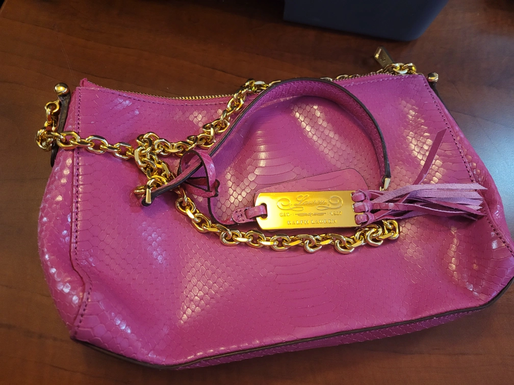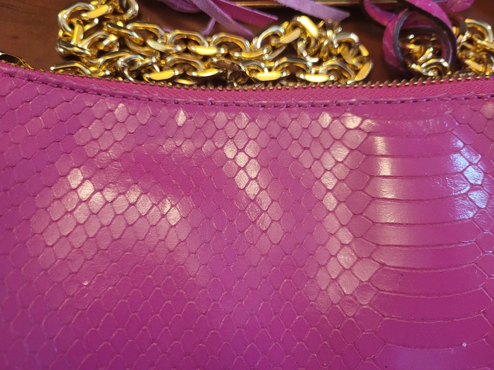 Gorgeous pink snakeskin crossbody purse. Gold chain strap and unique detail. Zipper closure. practically new, but without wrapping.