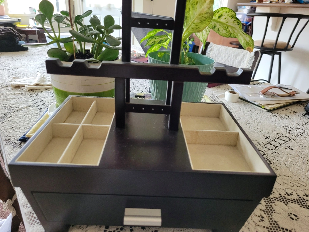 Jewellery box features a pull-out drawer and earring stand. Multiple compartments for rings, necklaces, and other accessories. Made of dark brown wood.