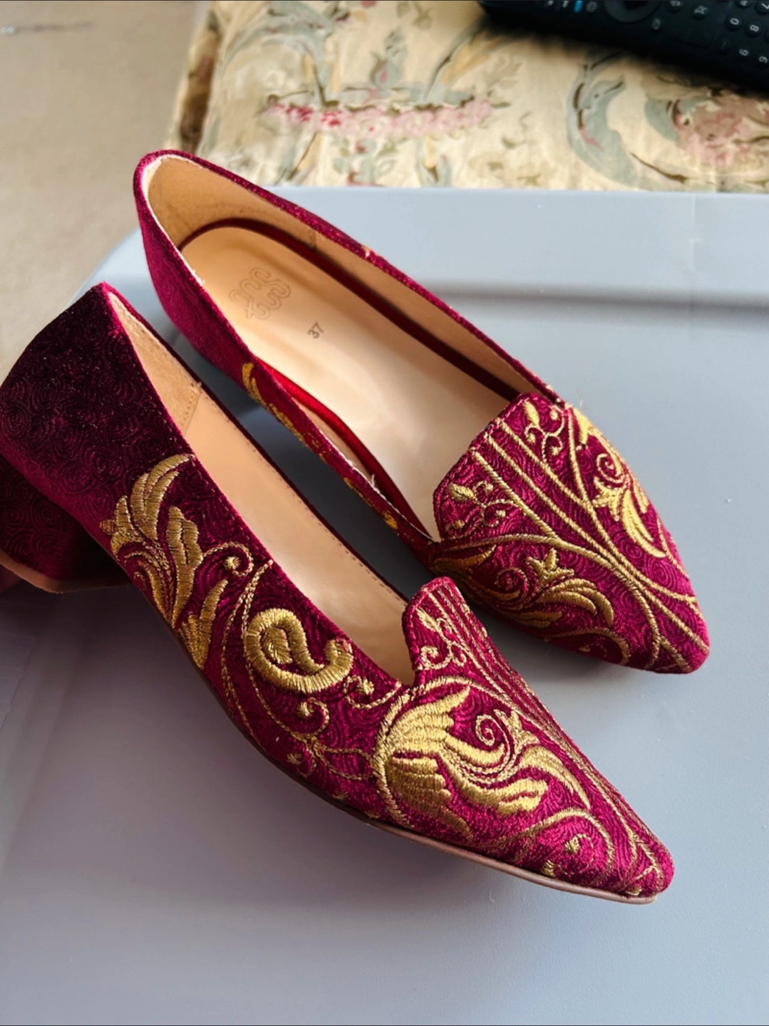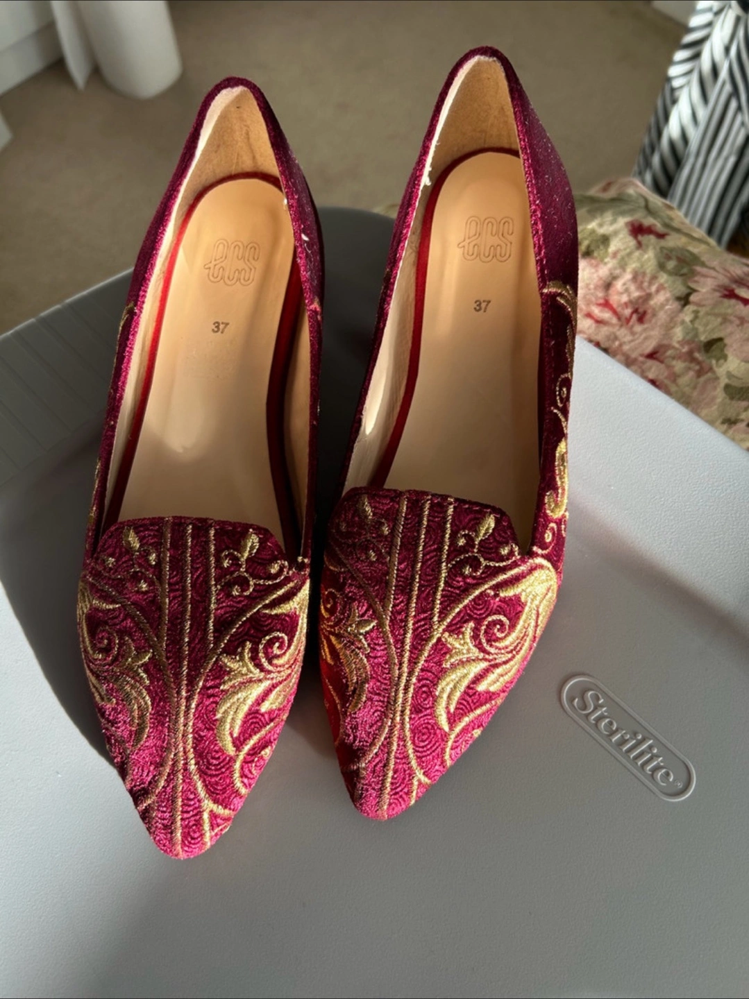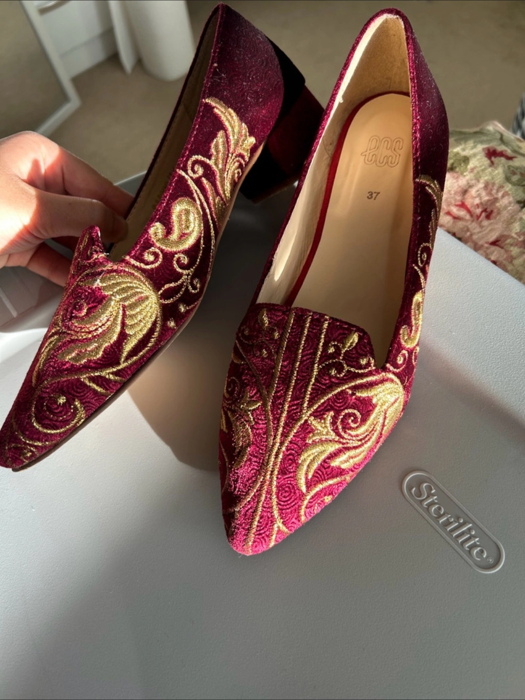 Elegant red stilettos with stunning golden embroidery, adding a touch of luxury to any outfit Gently used only once size 7 CASH ONLY