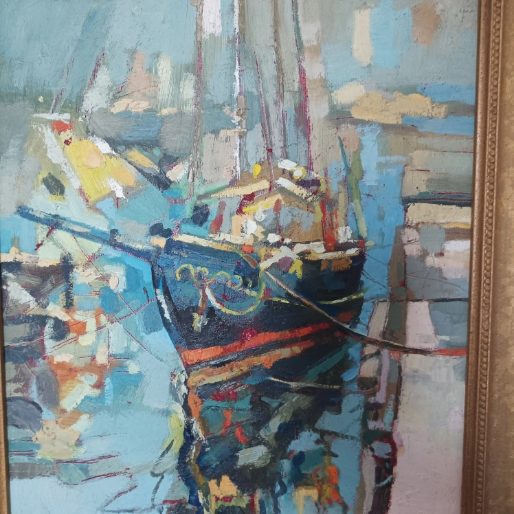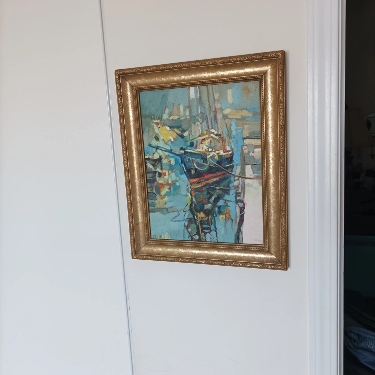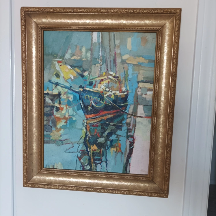 154Beautiful framed painting. Depicts a boat in a harbour. Gold frame. Unique style. Ready to hang. original oil painting on Canvas board 11" by 14"