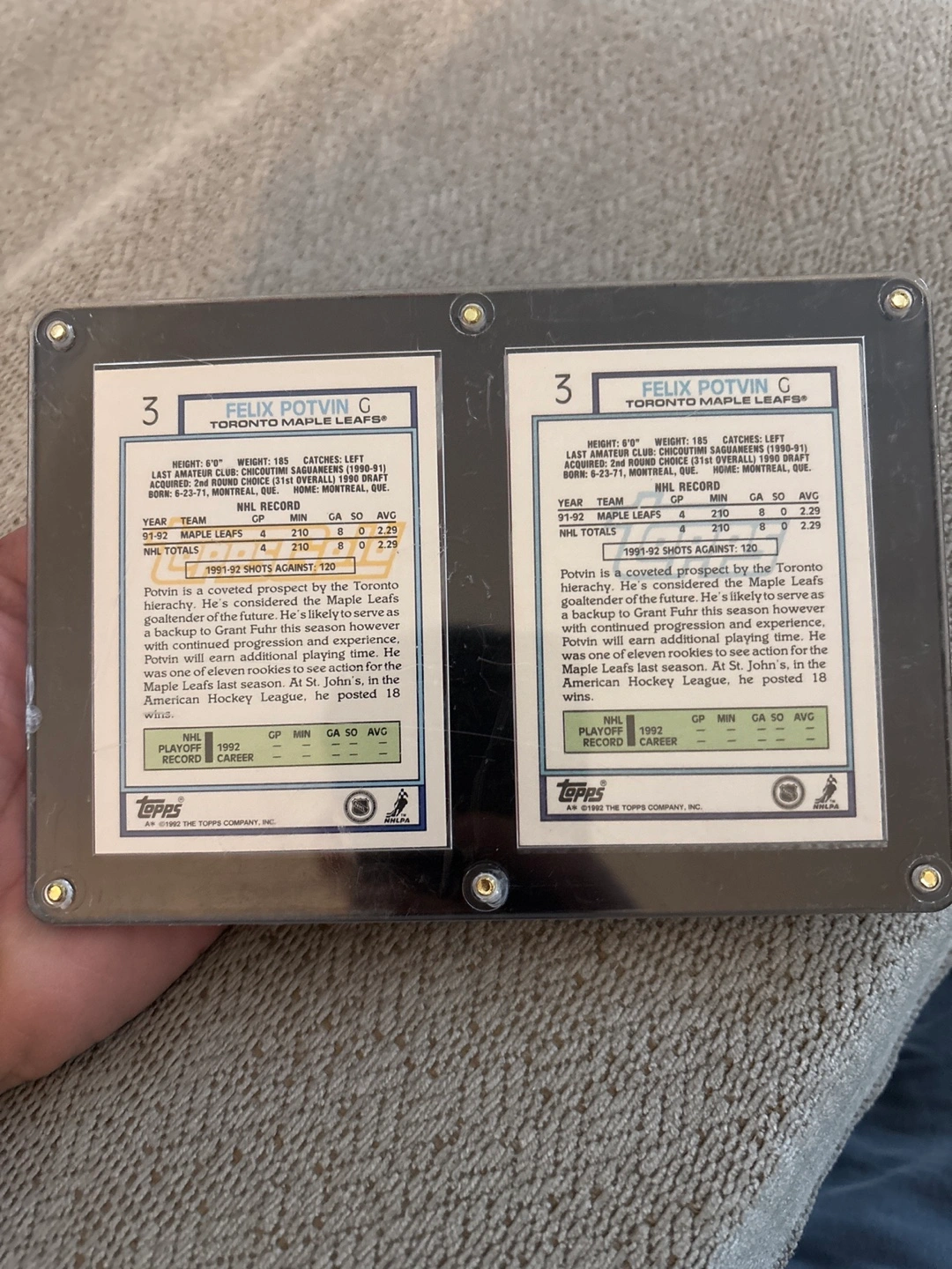 Autographed Felix Potvin Topps hockey card #3 & Topps Gold Card #3 Toronto Maple Leafs goalie. 1992 season. Cards in protective case.
