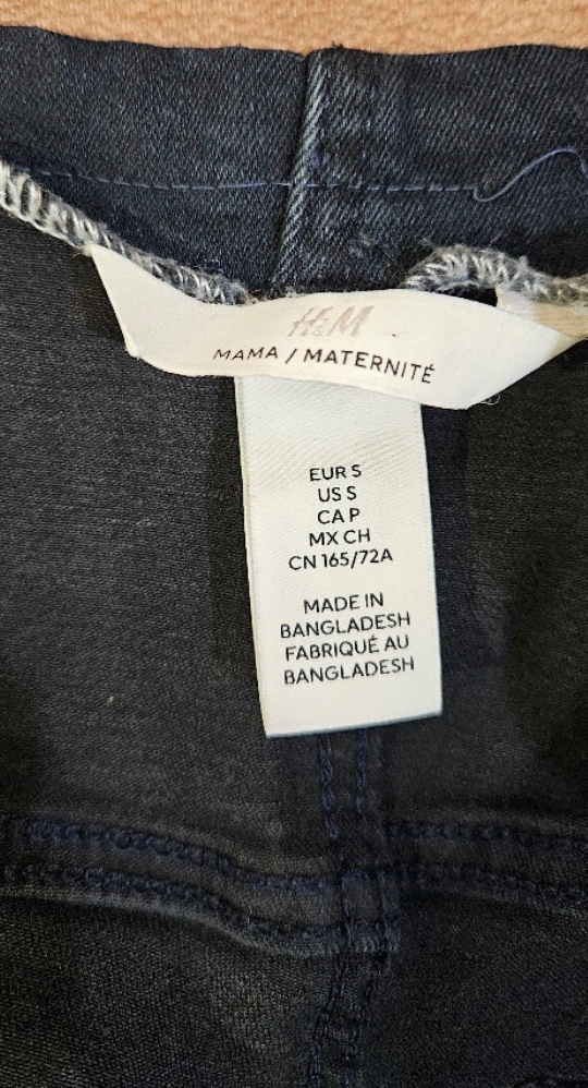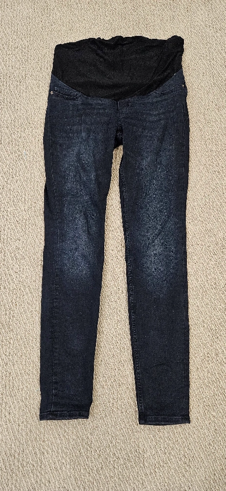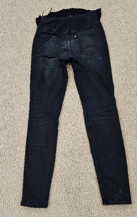 Dark wash maternity jeans. Over the belly band. Slim fit leg. Made in Bangladesh. Very comfortable. Used but very good condition.