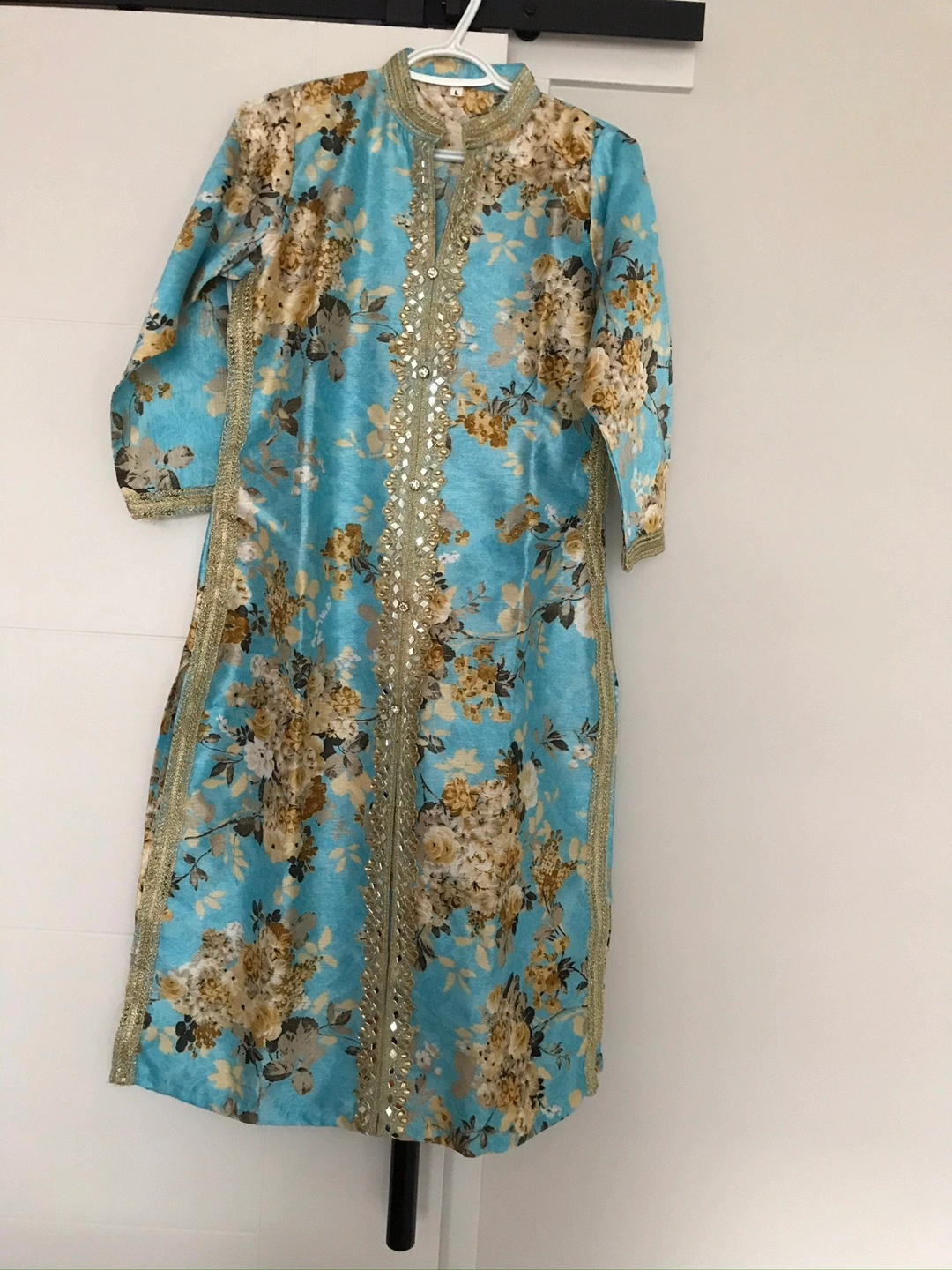 Stunning light blue floral Kurti. Three-quarter sleeves. Embellished with gold detailing. Ready to wear.