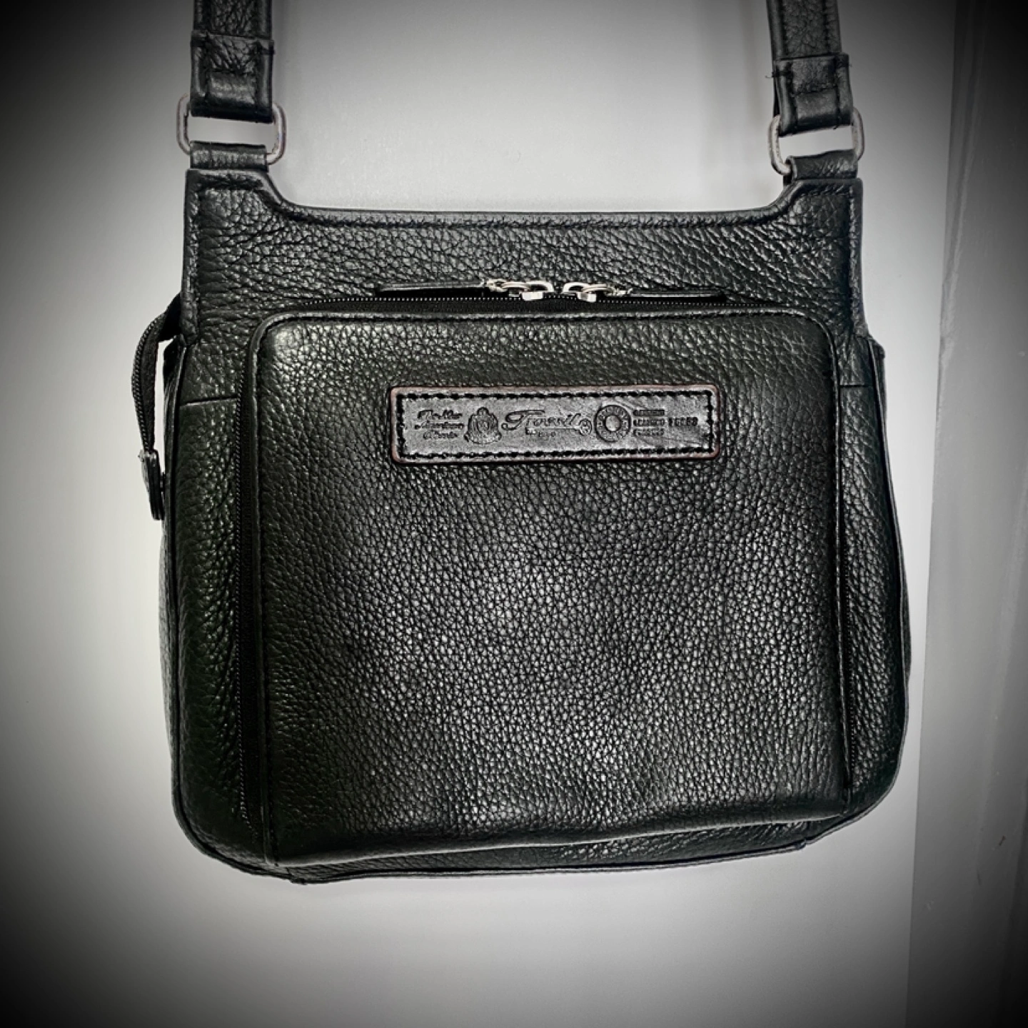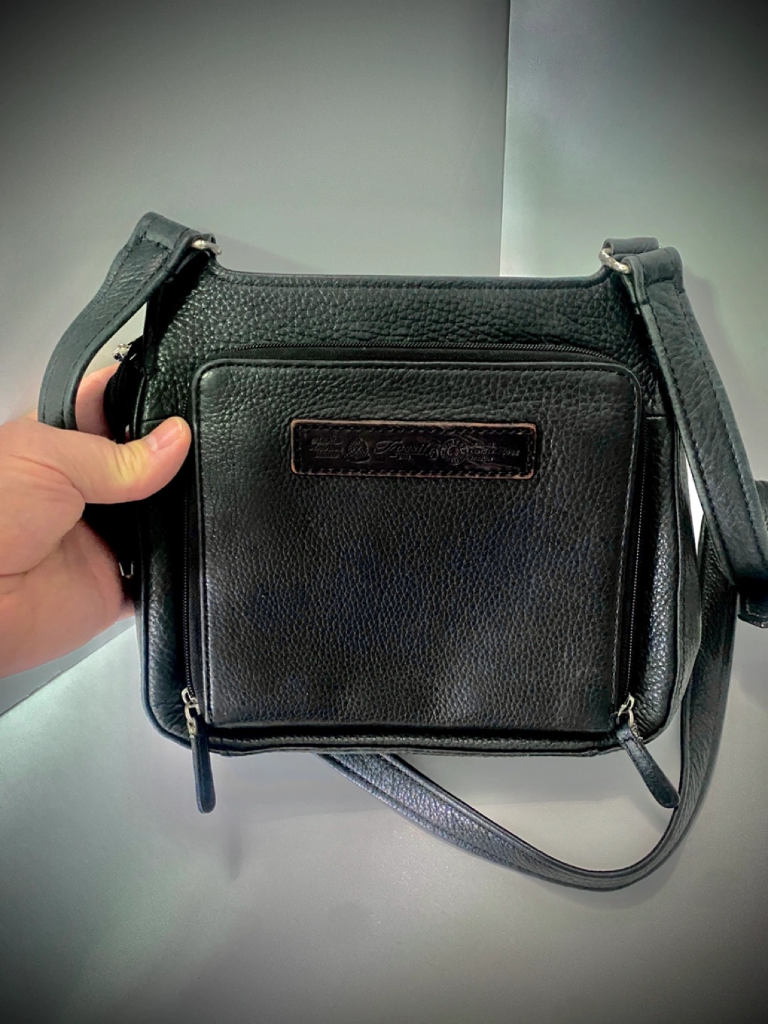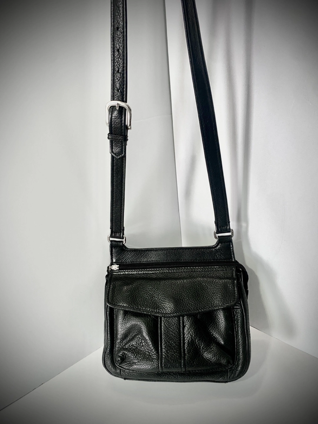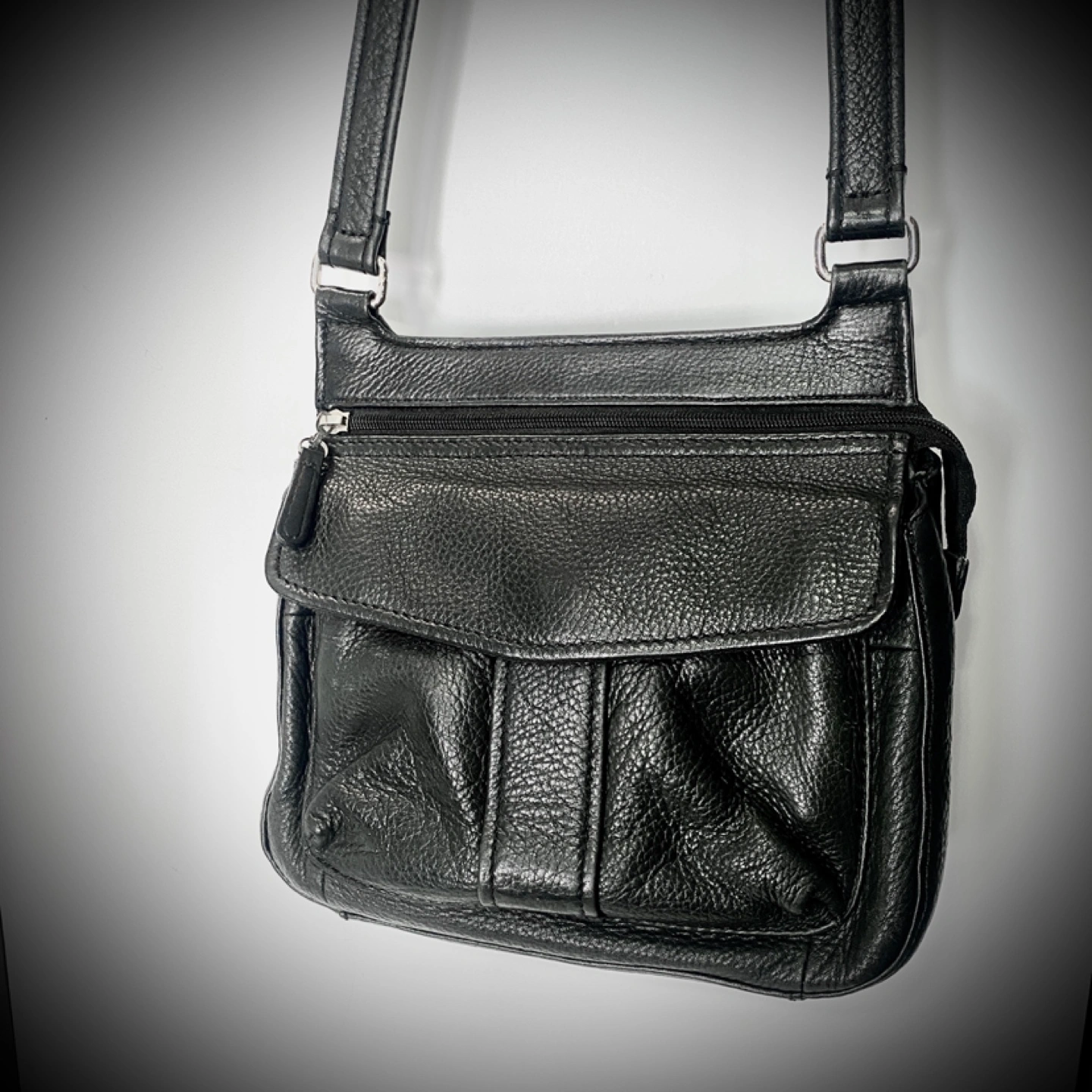 Small black leather crossbody bag. Multiple pockets and zipper closures. Adjustable strap. Great for everyday use.