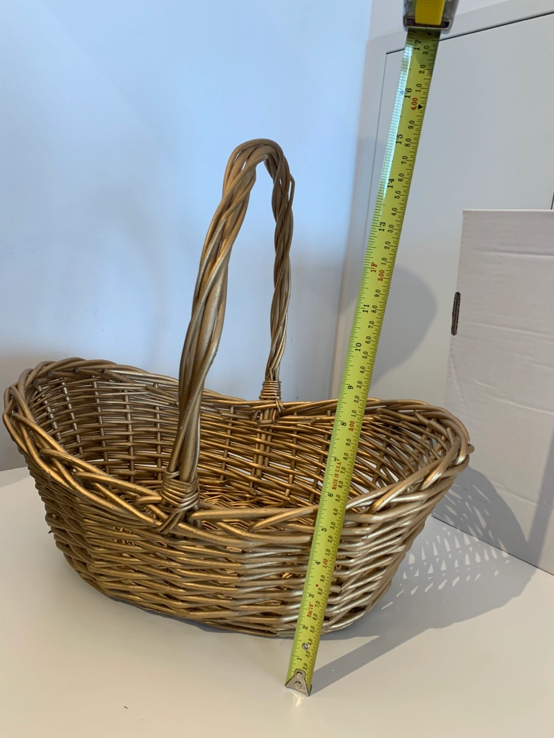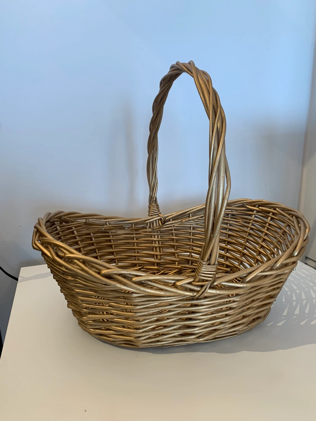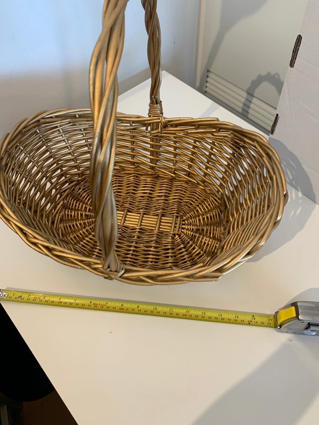 1000+Oval-shaped gold wicker basket. Features a woven design and an handle. Perfect for storage, decorative piece, Easter deco & eggs Hunt, make gift baskets, etc. Measures approximately 17 inches long. Good condition. The Gold colour is not overpowering, it stays a classy shade. Pick-up. Cash. No holds (first come first served). 💛~Look at my other listings to create great bundles discounts.
