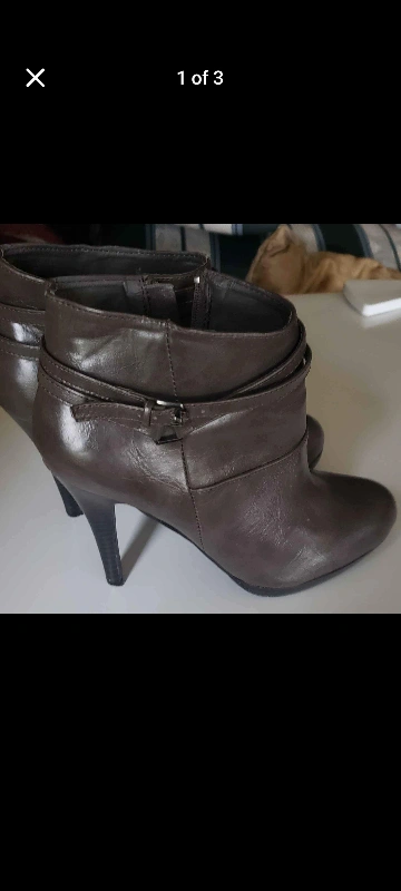 Brown Le Chateau leather ankle boots. High 4.5 inch heels. Side zipper closure. Buckle accents. Used in very good condition, $15, pick up only, please see my other listings.