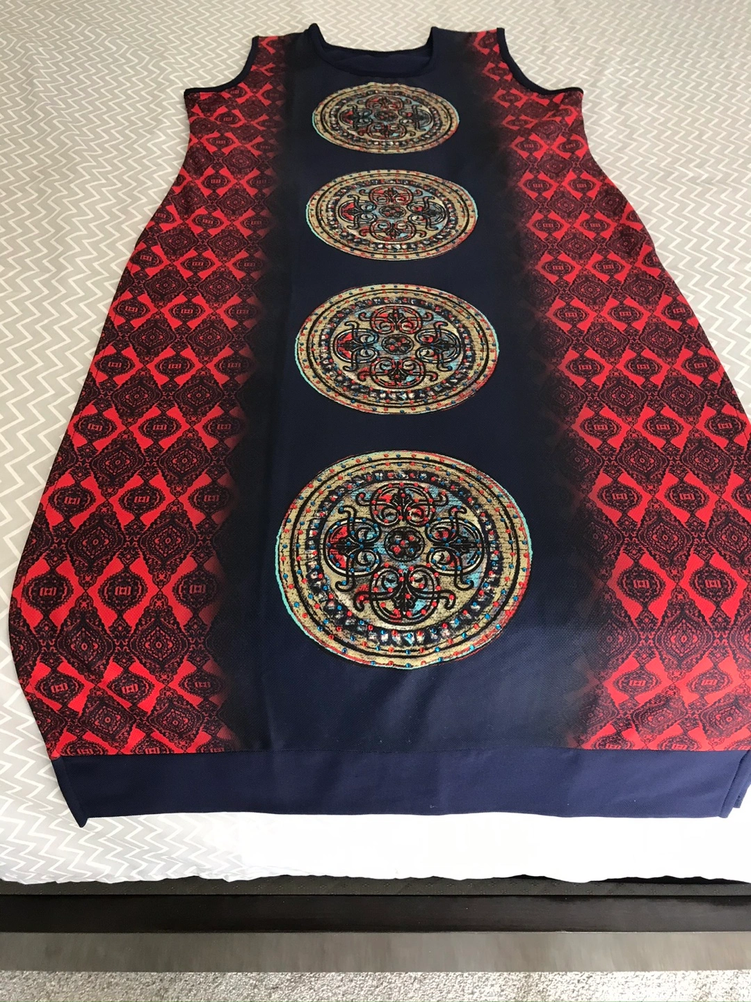 Women's sleeveless tunic dress. Features a navy blue base with red and gold patterned design. Relaxed fit, knee-length. Great for casual wear.