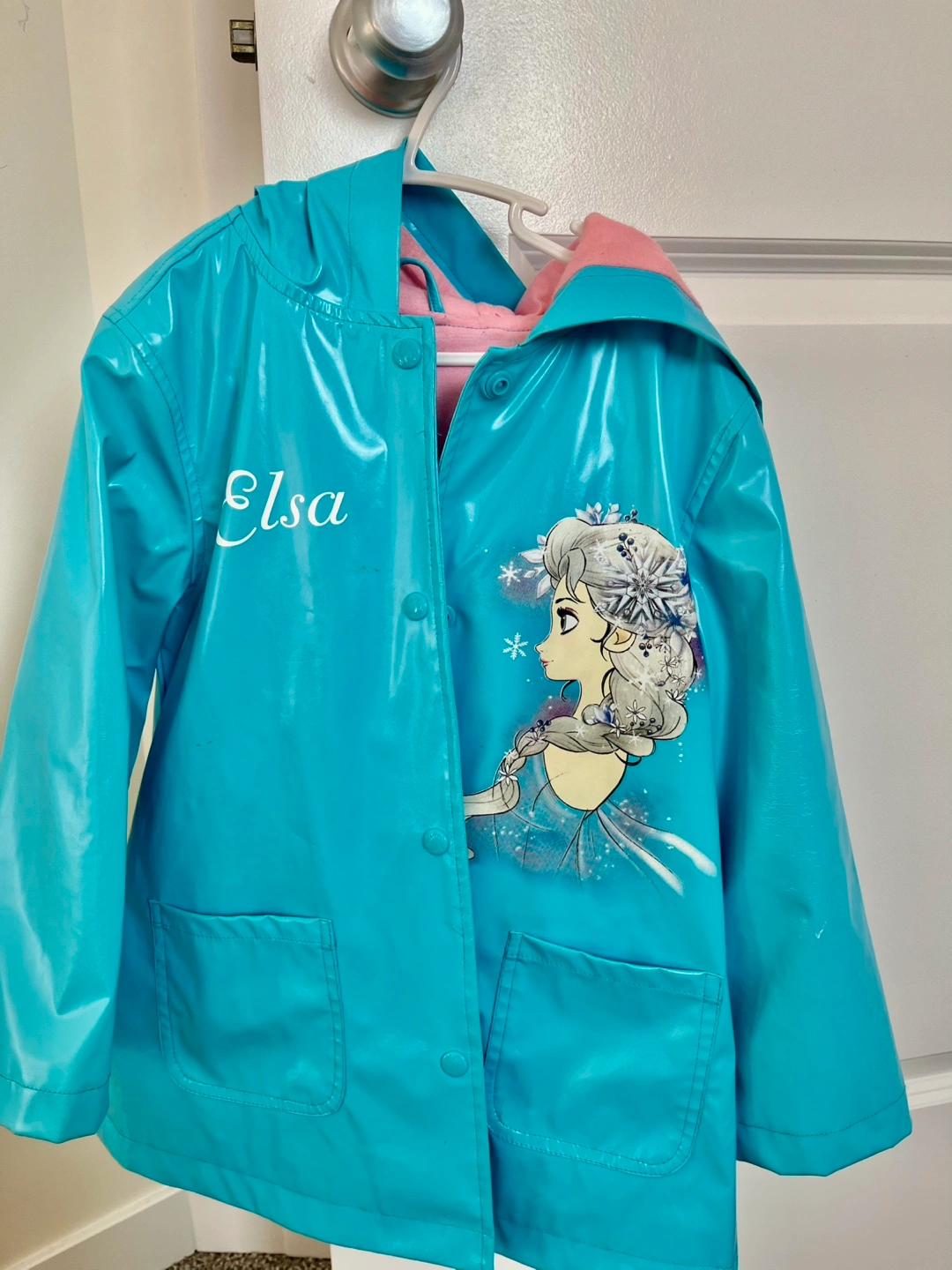 Girls' light teal raincoat. Features Elsa graphic, pink interior hood lining, and snap closures. Size 6.