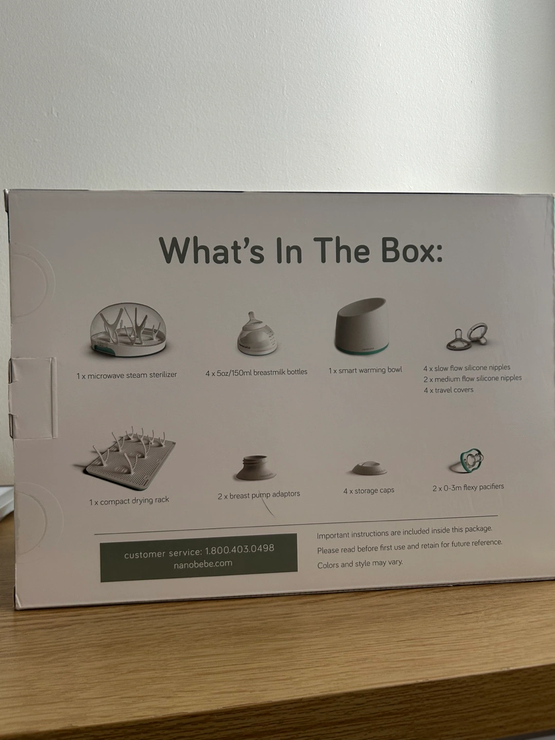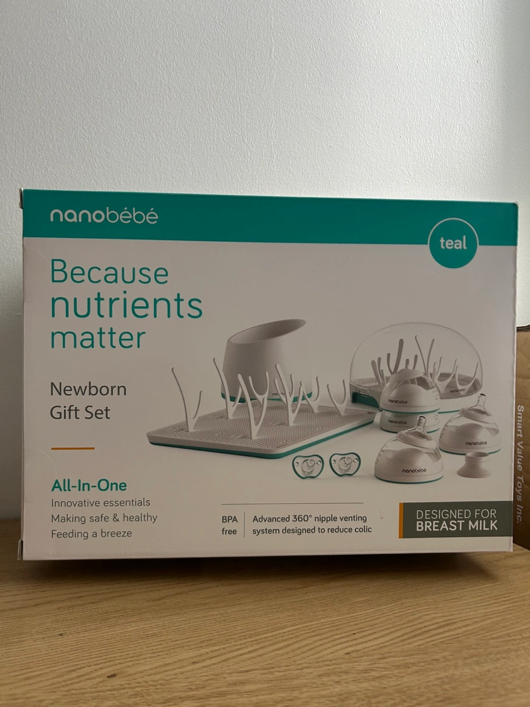 Newborn gift set includes microwave steam sterilizer, four 5oz breastmilk bottles, warming bowl, drying rack, pump adaptors, pacifiers and storage caps. BPA free. Designed for breast milk. Advanced 360° nipple venting system.