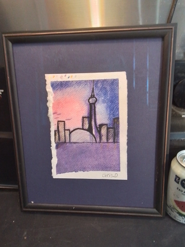 Unique watercolor painting of the Toronto skyline. Features the CN Tower and other city buildings. Artist signature visible. Dark brown frame. Small, colourful accents visible near the top of the artwork. Signed Chris. D