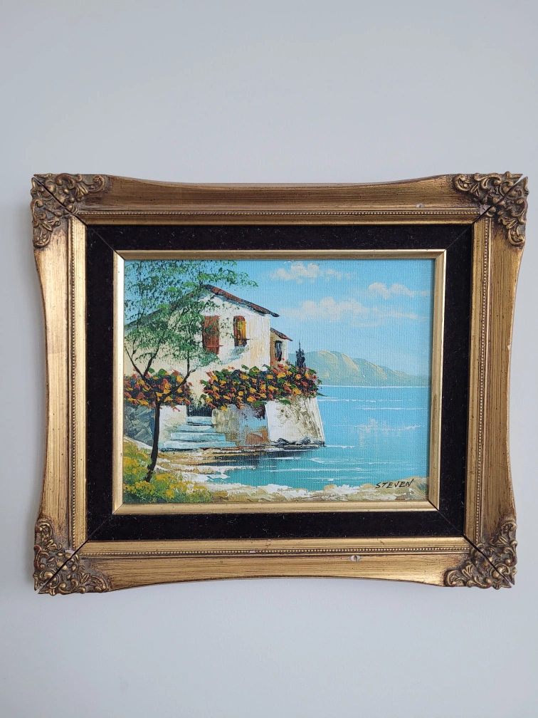 Framed artwork. Gold ornate frame of a quaint Mediterranean style scene to take you back to a quiteter, more simple time. Small pale yellow coastal house decorated with flowers to bring the sound of the sea to your home. Artist signature STEVEN.