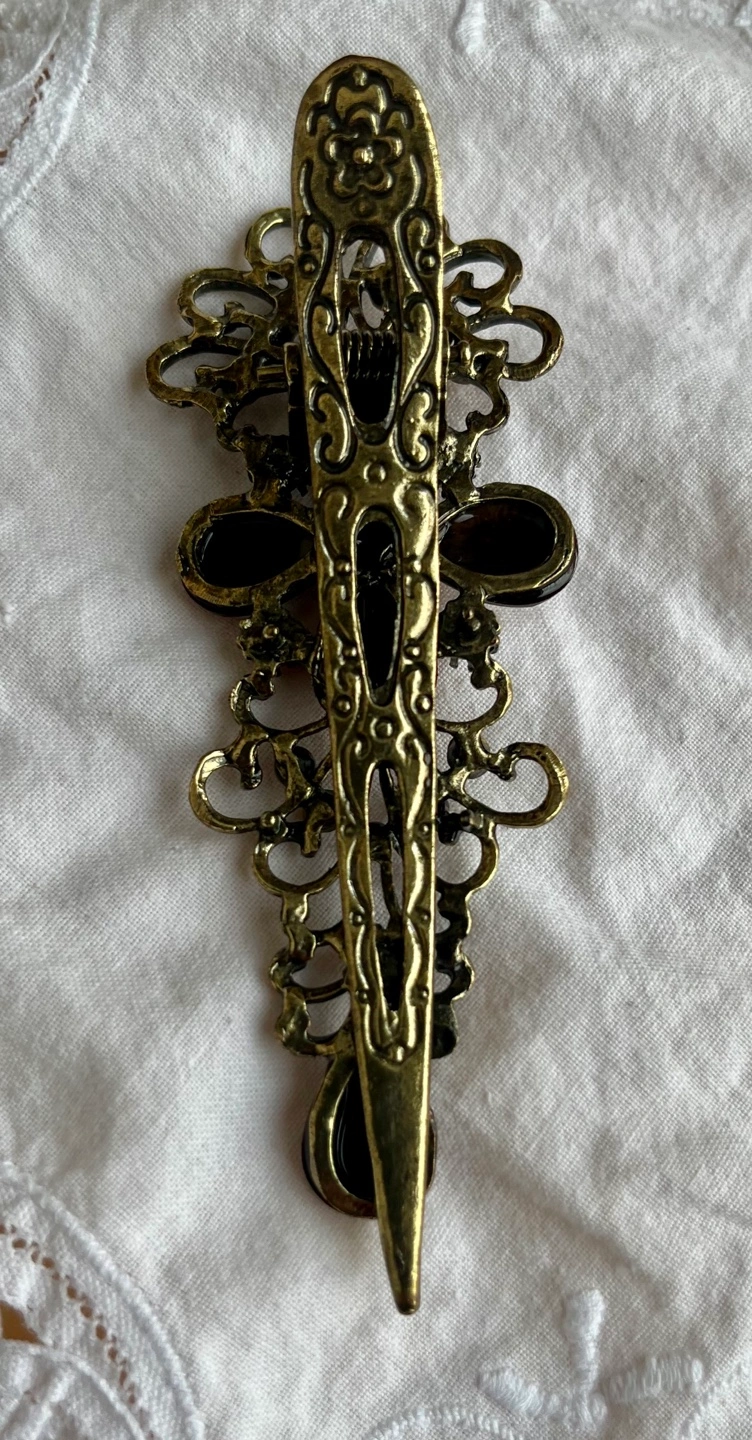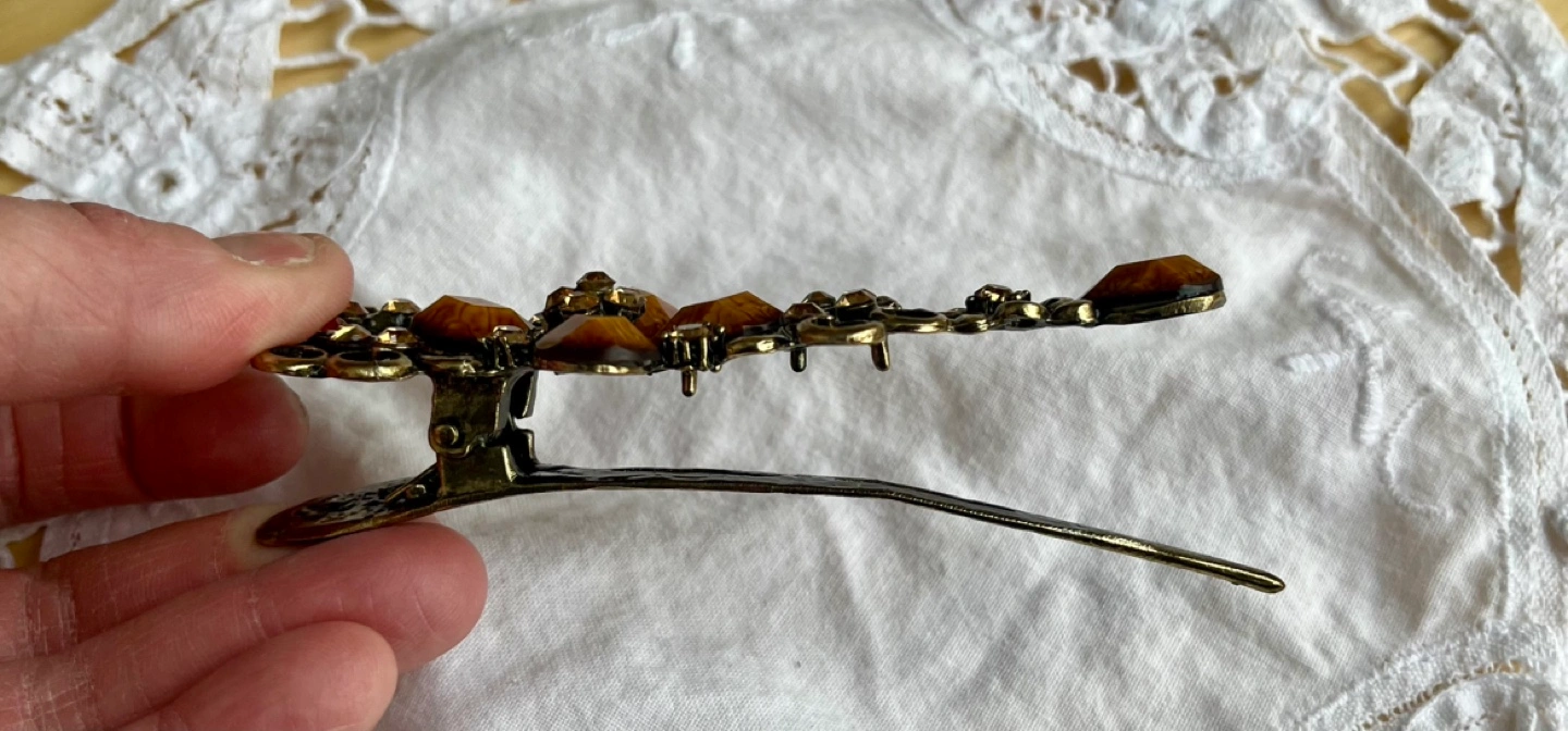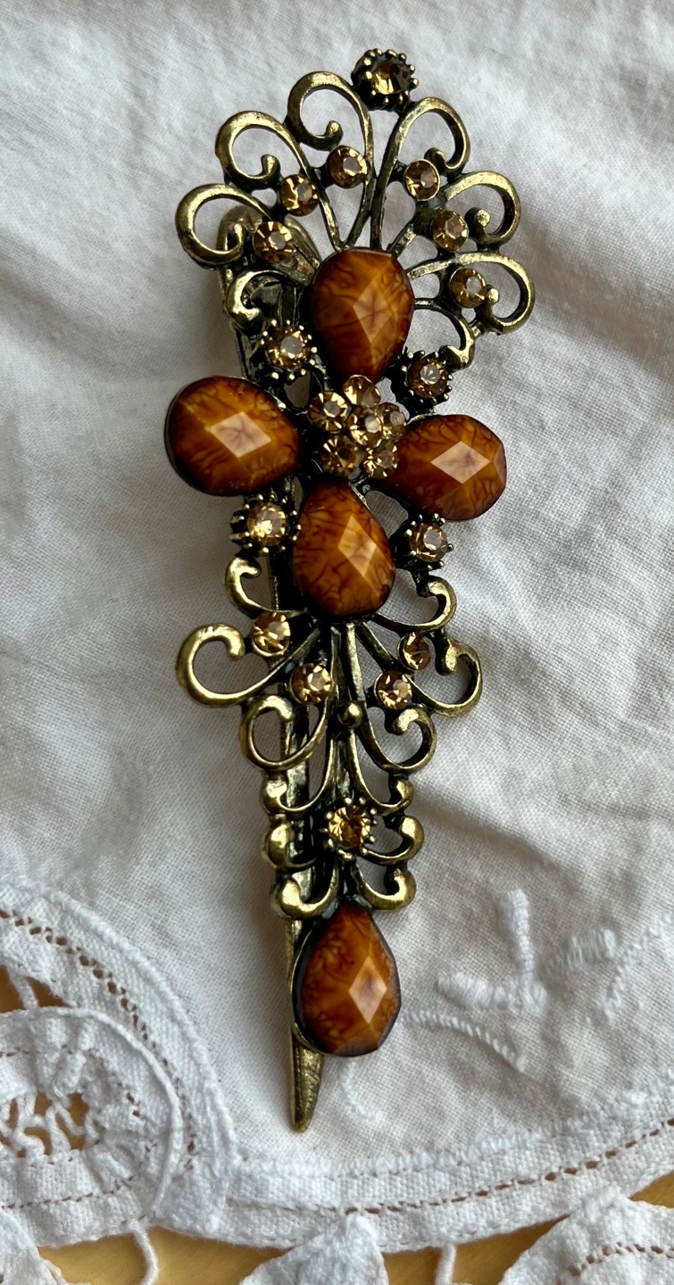 Antique Gold Tone Hair Clip with Brown Rhinestones