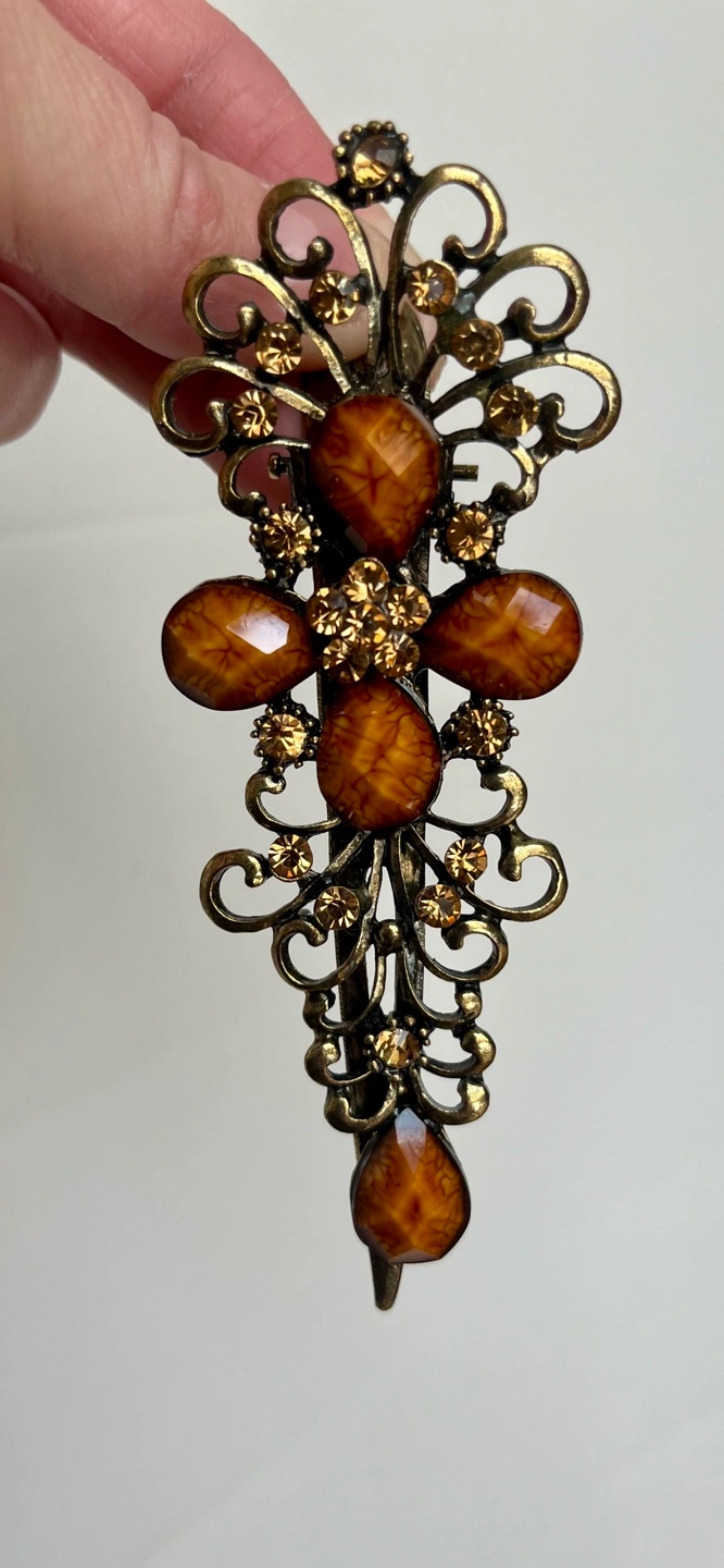 Ornate hair clip. Features a gold tone metal design. Amber coloured stones and clear rhinestones. Unique statement piece.